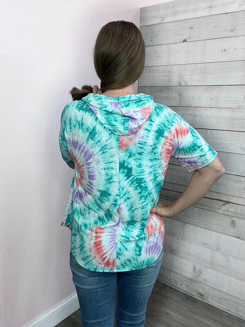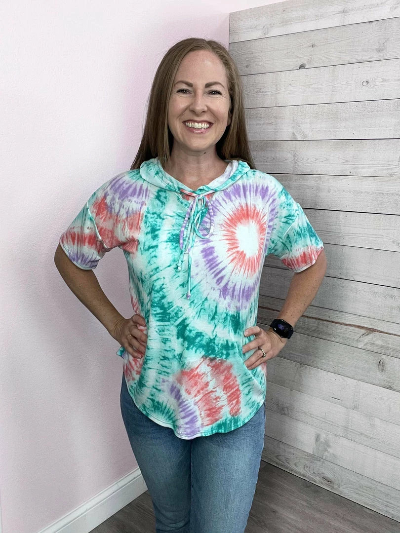 Circular tie-dye top featuring a hoodie with drawstrings, short sleeves, and dolphin hemline. Lightweight sweatshirt material. True to size!