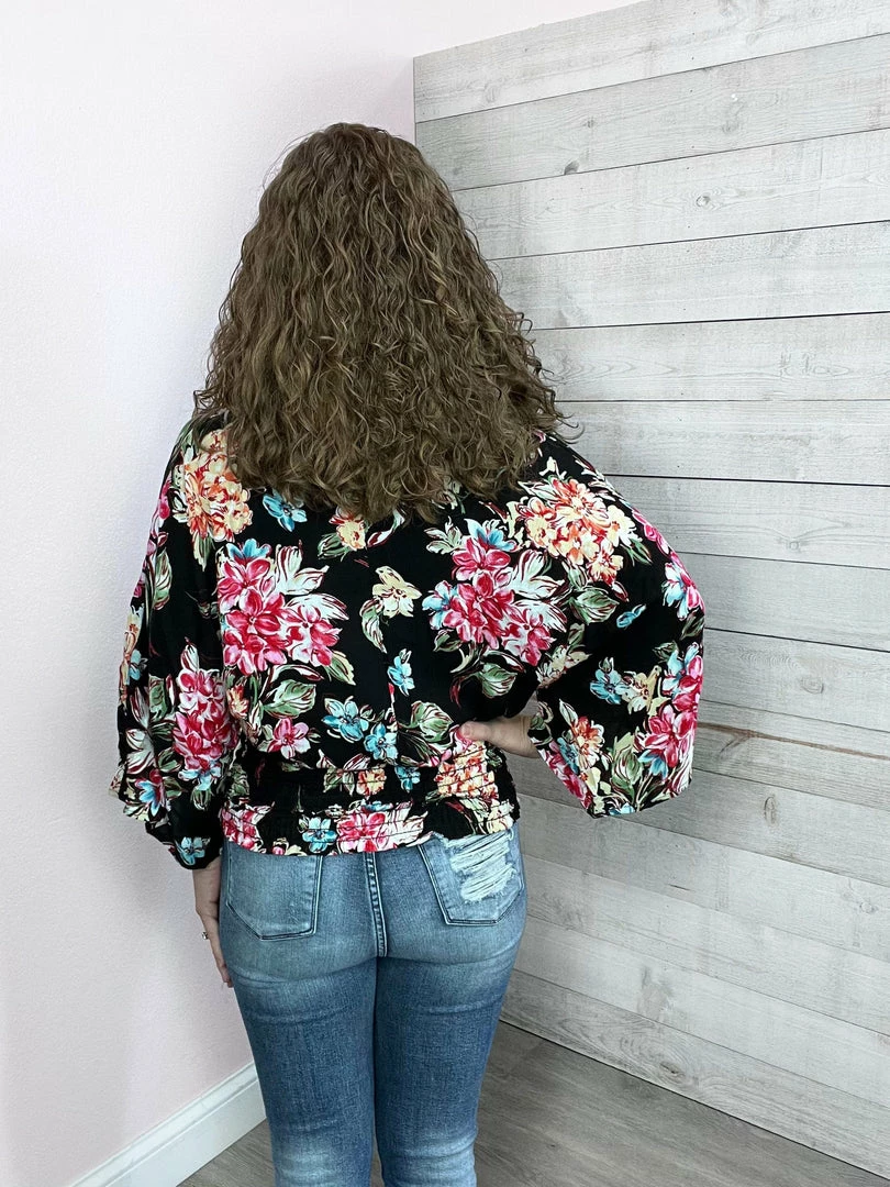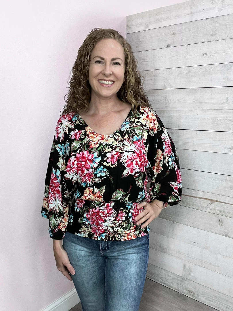 Bold floral top featuring a V neckline, kimono sleeves, and smocked banded hemline. True to size!