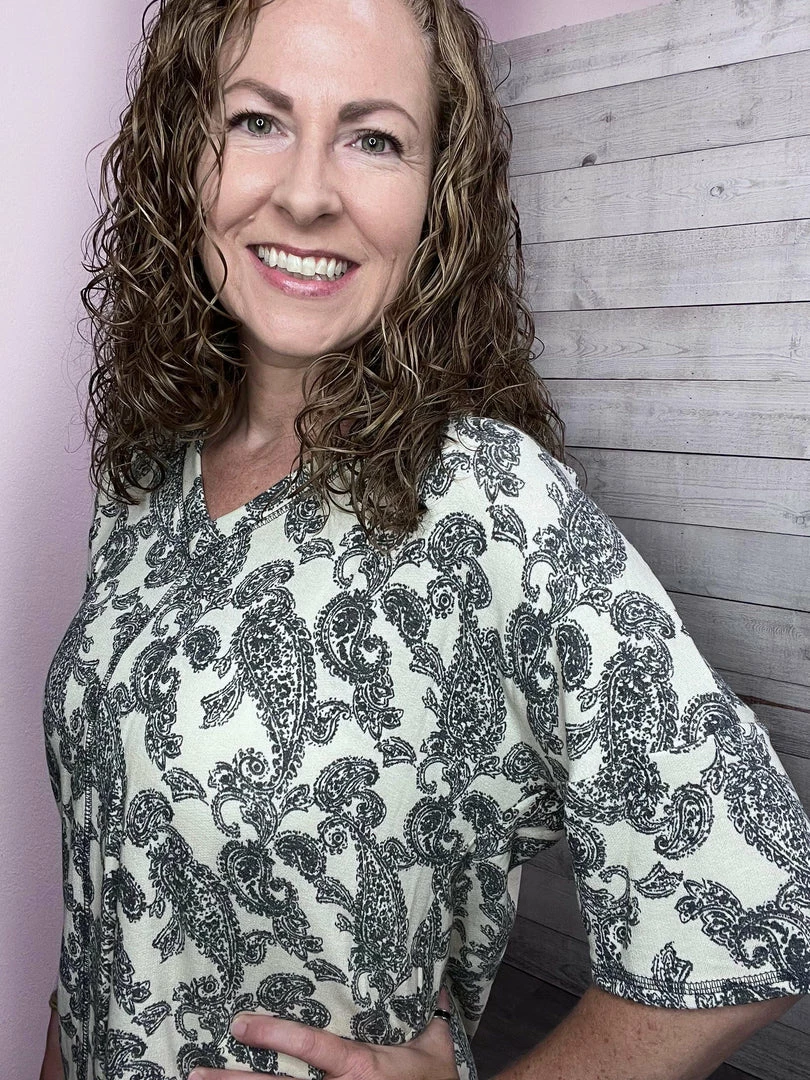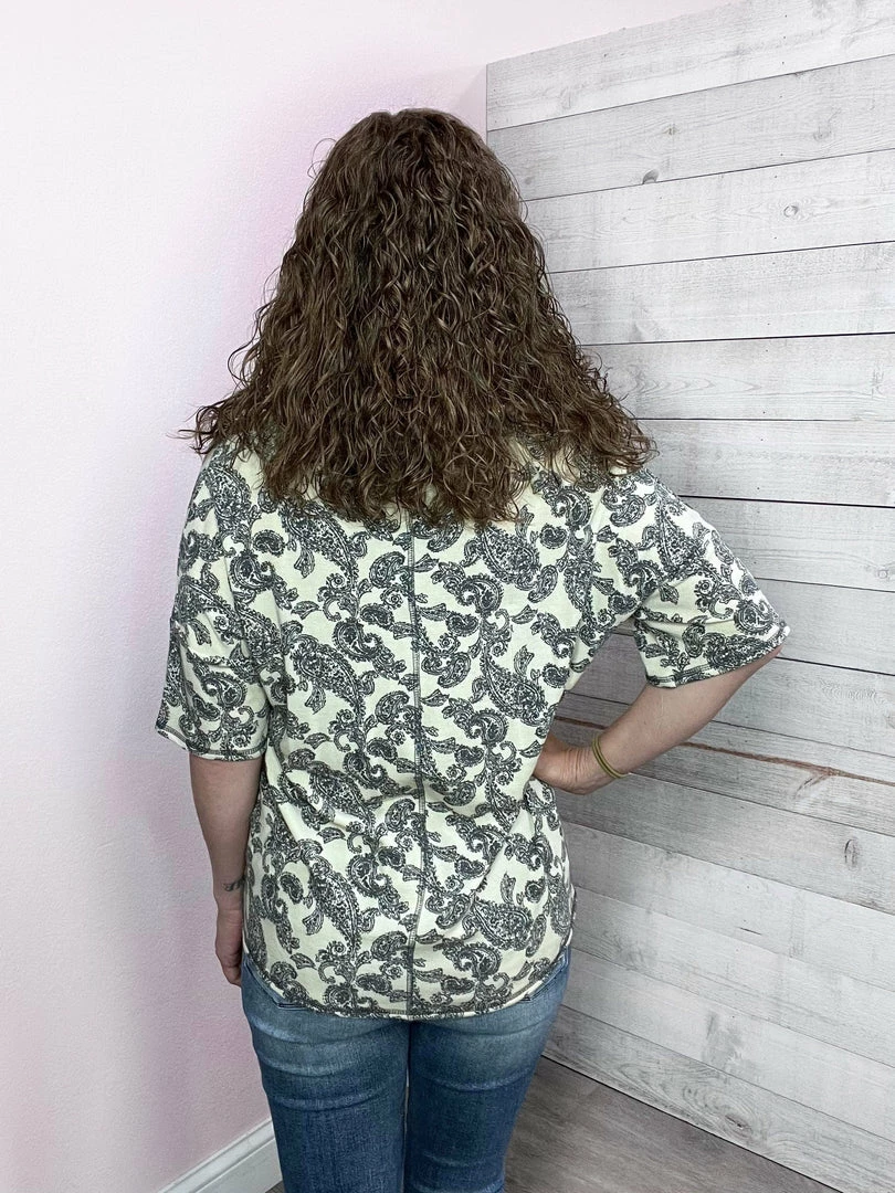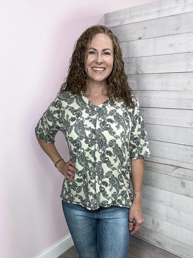 Paisley print top featuring a V neckline, short sleeves, and a loose fit with stitch detail. True to size!