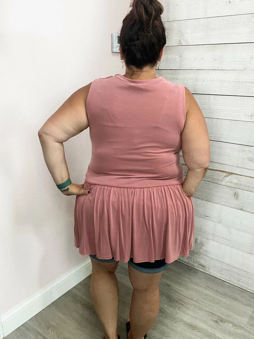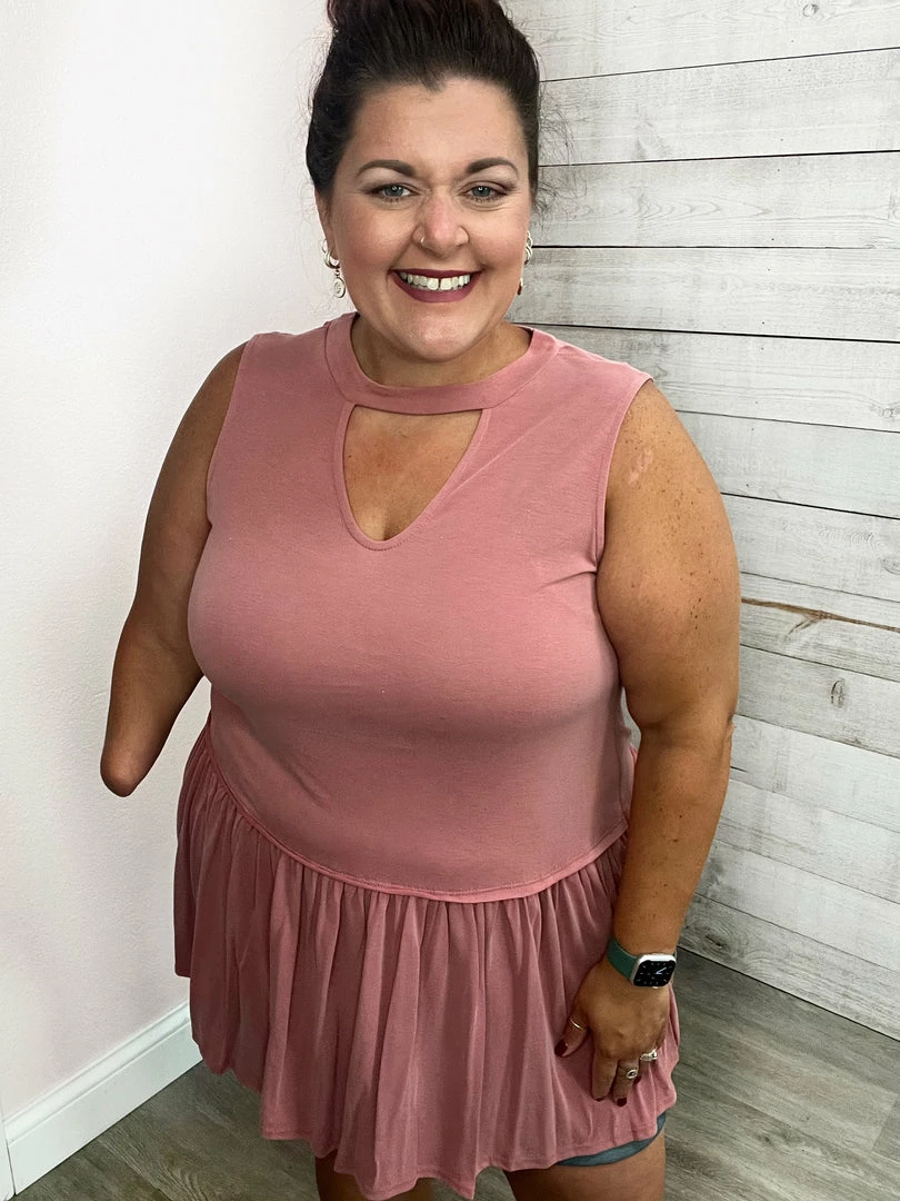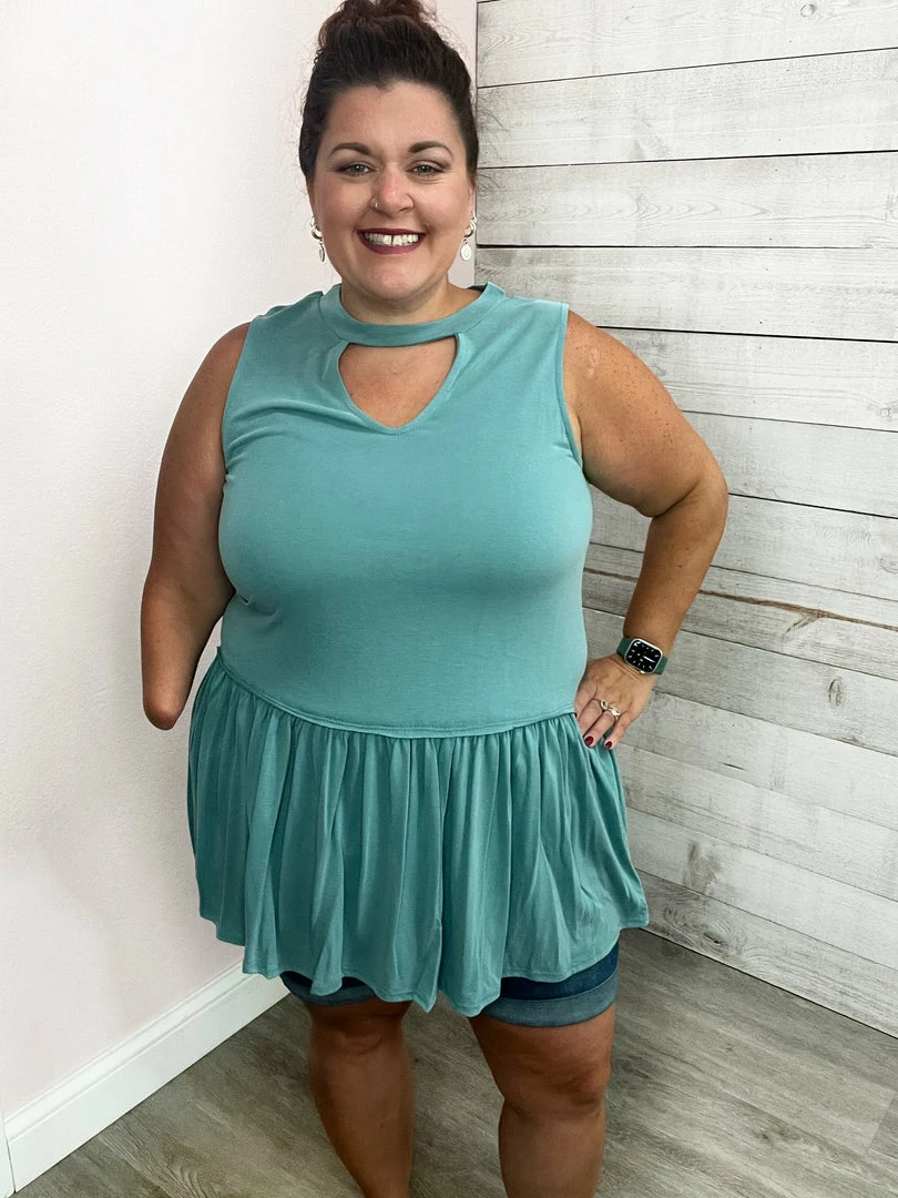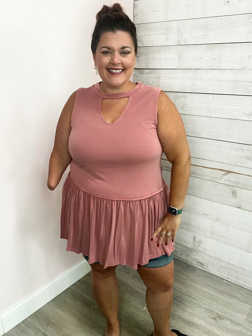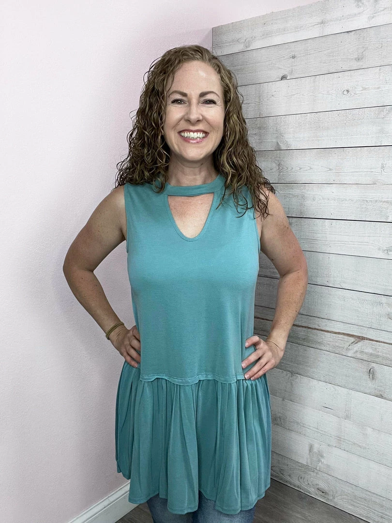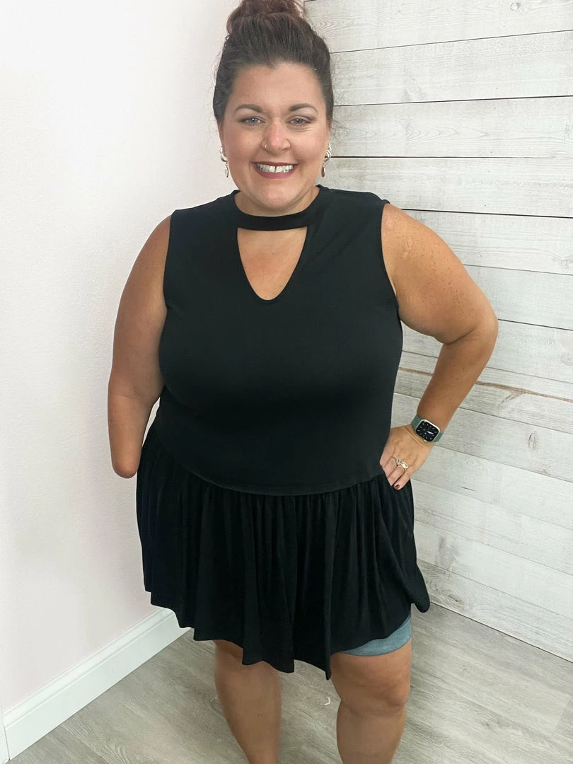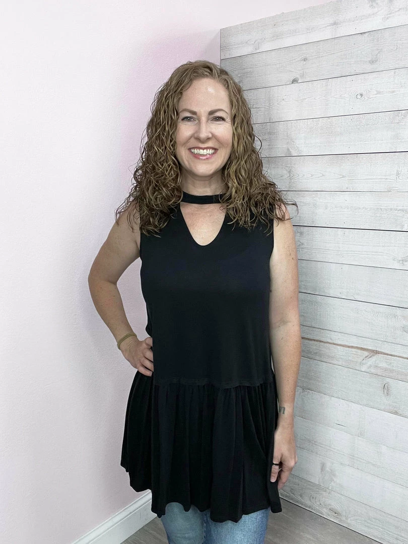 Sleeveless tunic top featuring mock neck cutout and ruffled hemline. True to size or down.