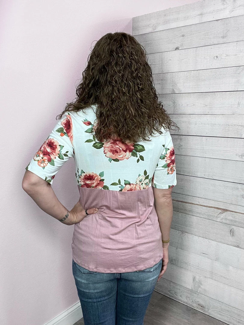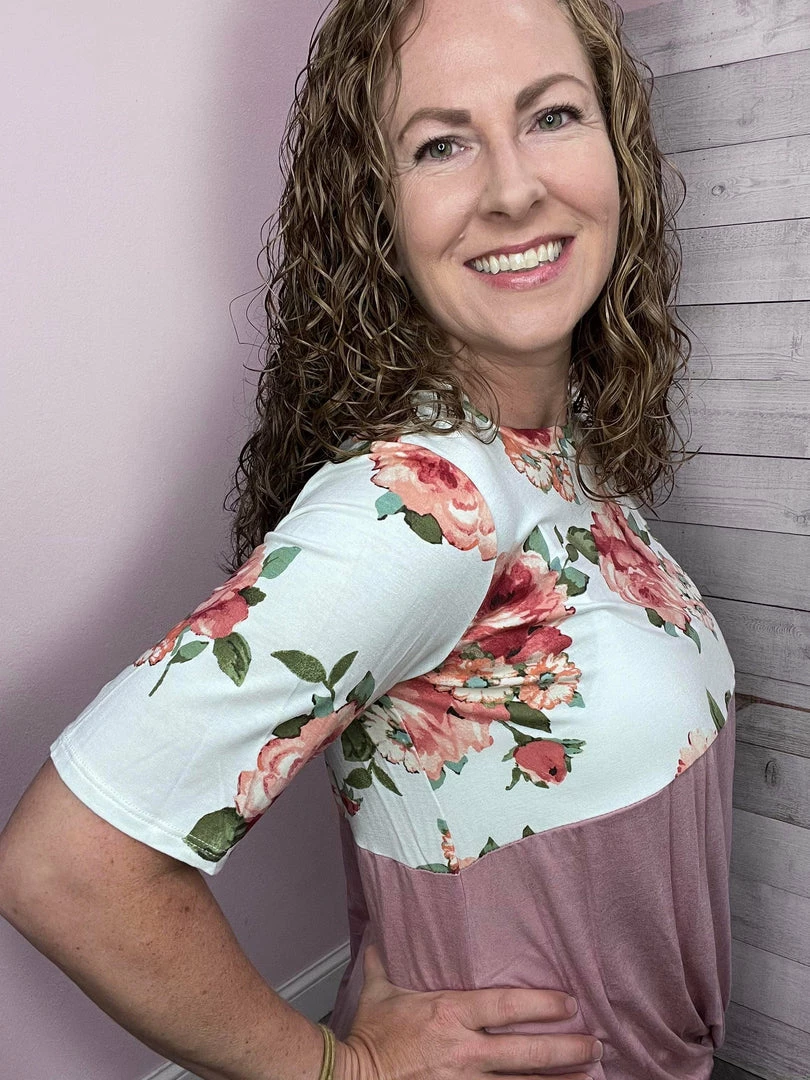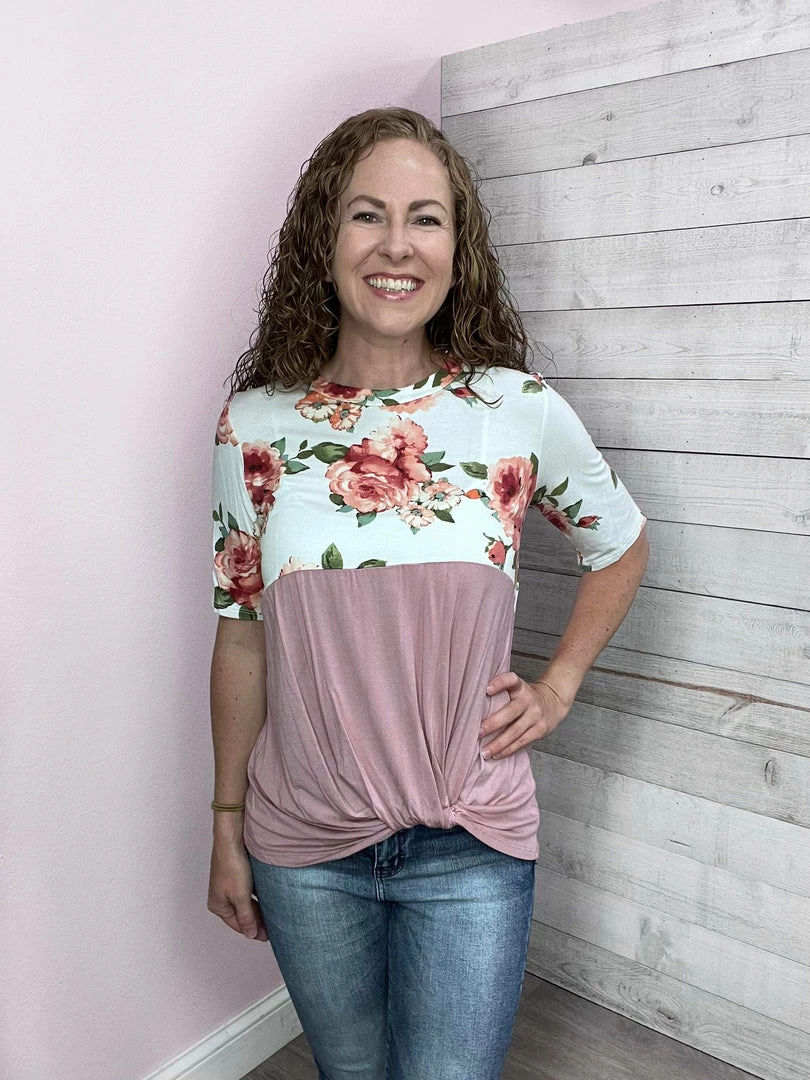 Front twist top featuring a floral print on top and solid mauve on the bottom. Also features a round neckline and short sleeves. True to size!