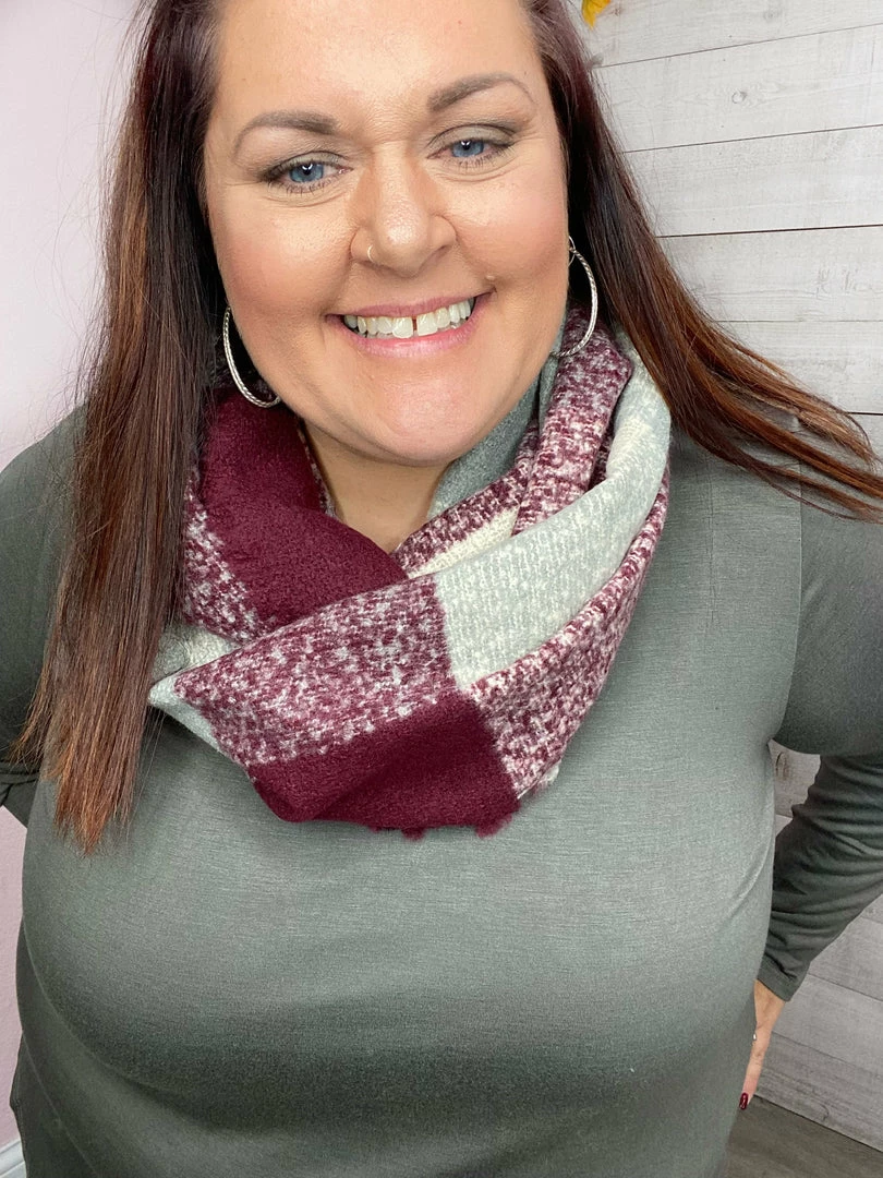 Block plaid pattern infinity scarf with frayed hem. So soft and comes in multiple colors!