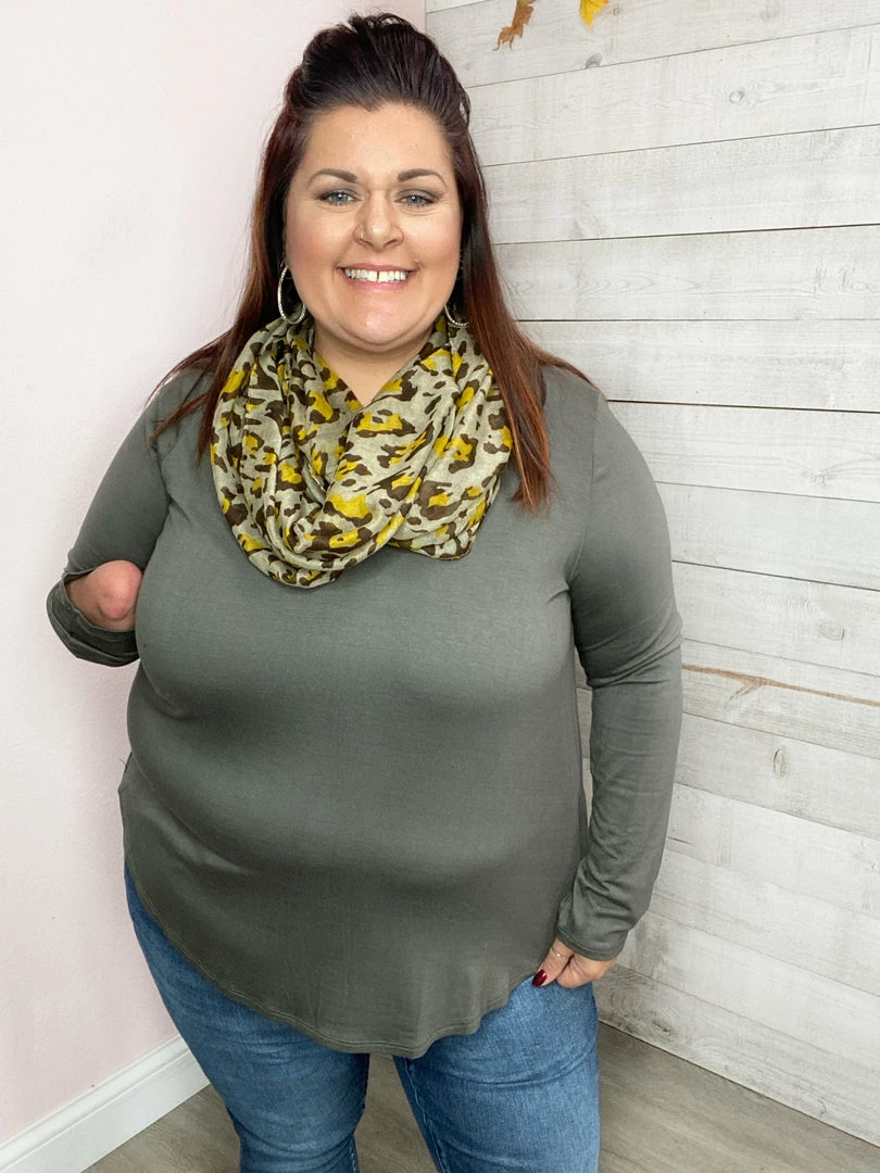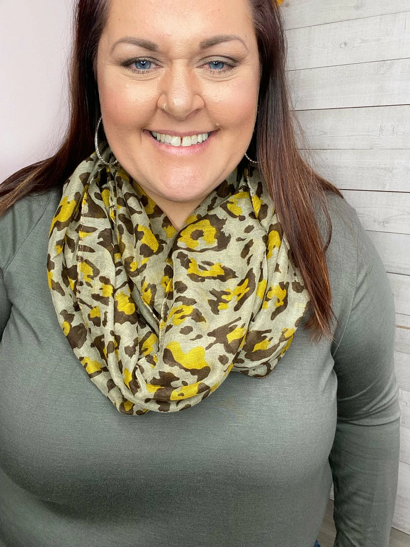 Lightweight infinity scarf. Brown and yellow colors make up this catchy animal print pattern.