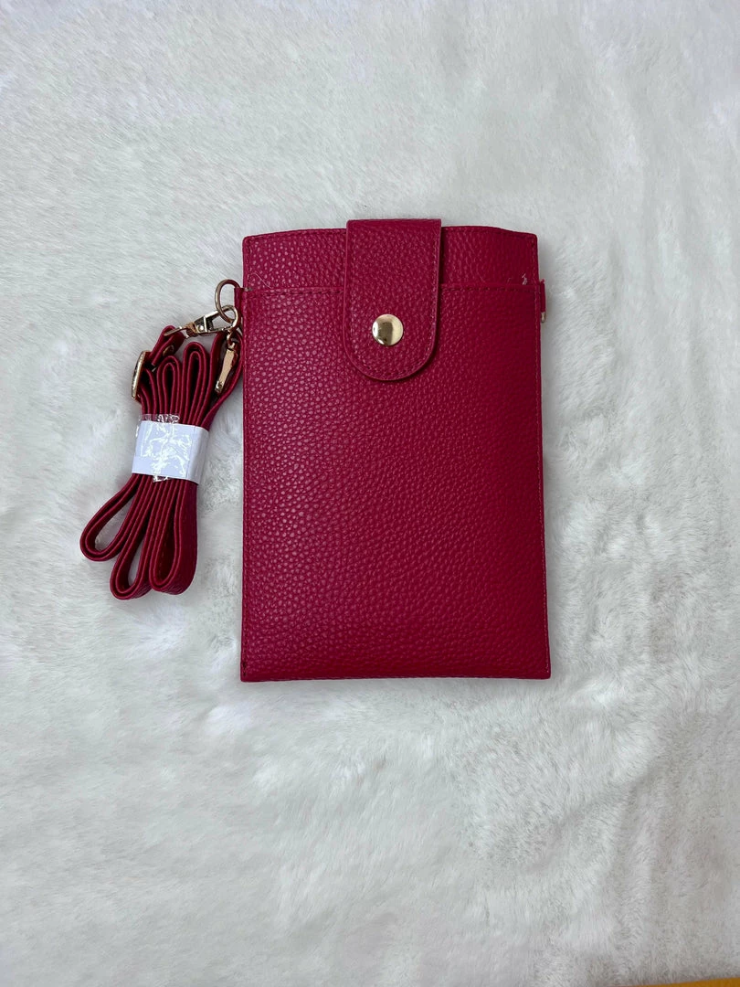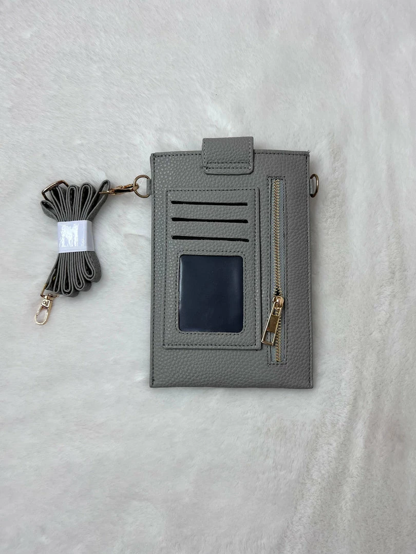 Cellphone crossbody wallet featuring an adjustable strap, button top closure, and a zipper front pocket with card slots.