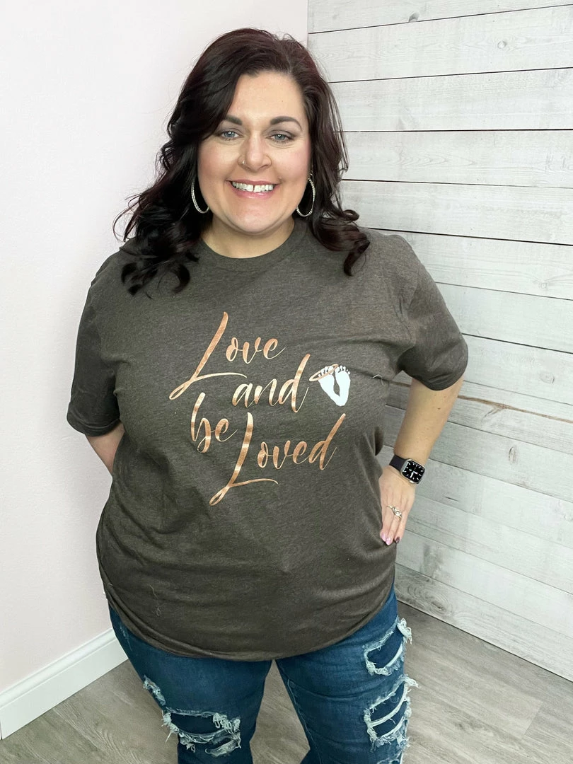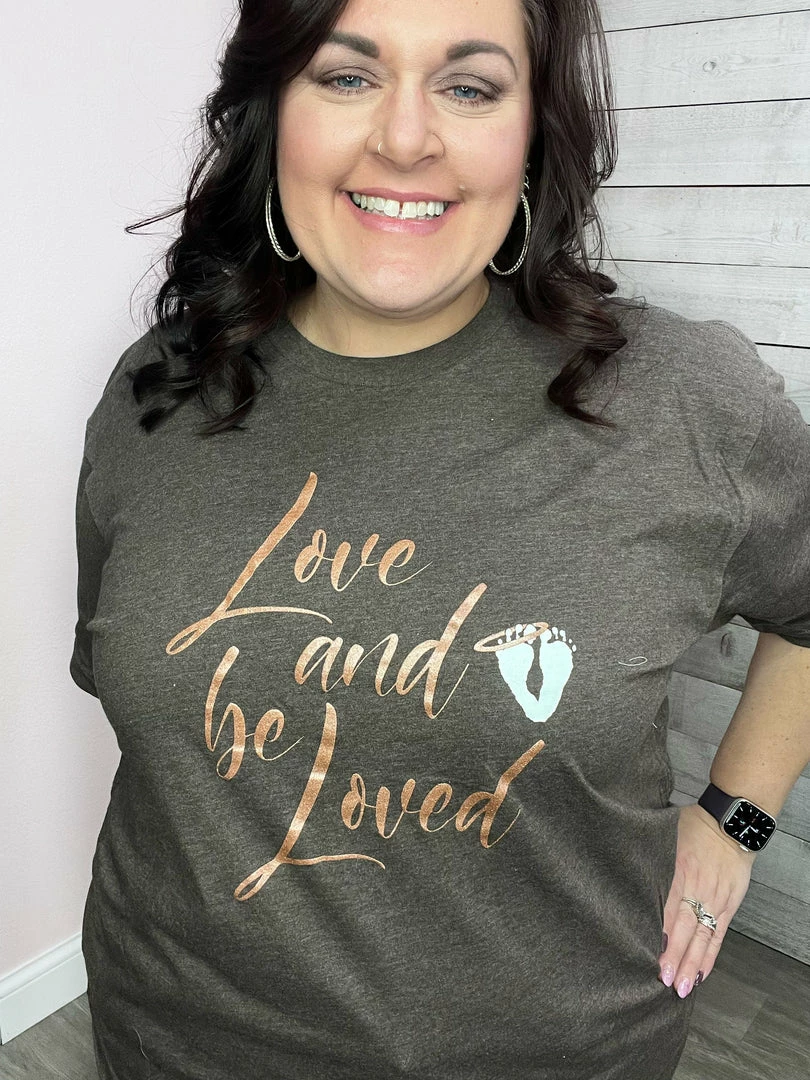 Baby feet with halo and Bronze shimmer Love And Be Loved graphic on a Brown short sleeve t-shirt. True to size!