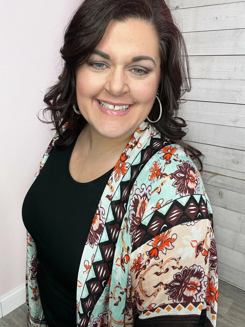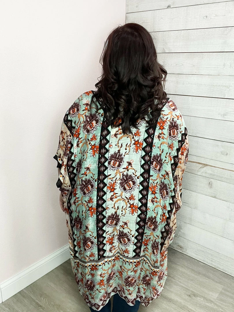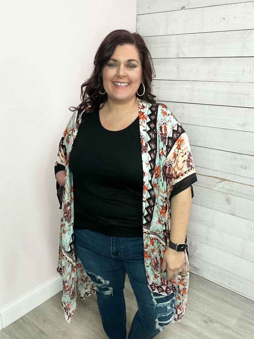 Floral abstract kimono featuring short sleeves and side slits. Colors include Mint, Orange, Peach, Purple, Brown, and Black. One size fits most.