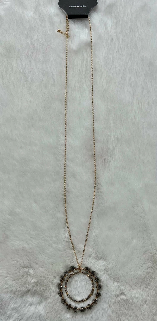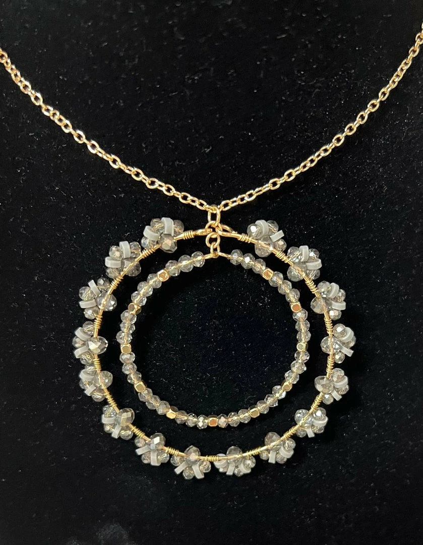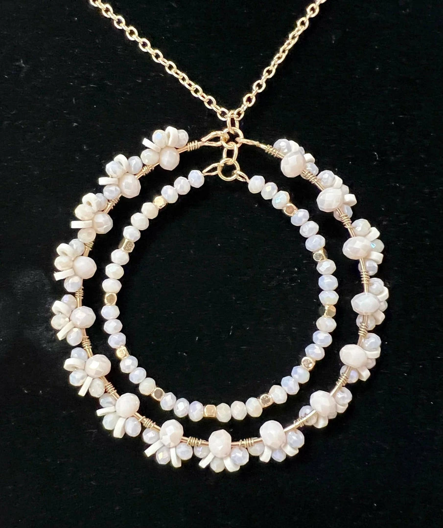 Flower beads on gold double circle wire on a long gold chain. Comes in two colors Grey or Ivory.