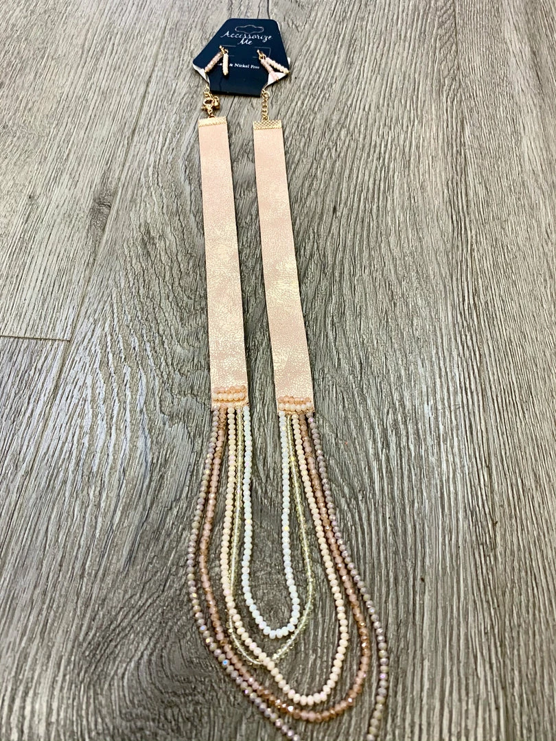 Accessorize Me New Arrivals Necklace & Earring Set- Rose Gold Leather & Beige Seed Beads