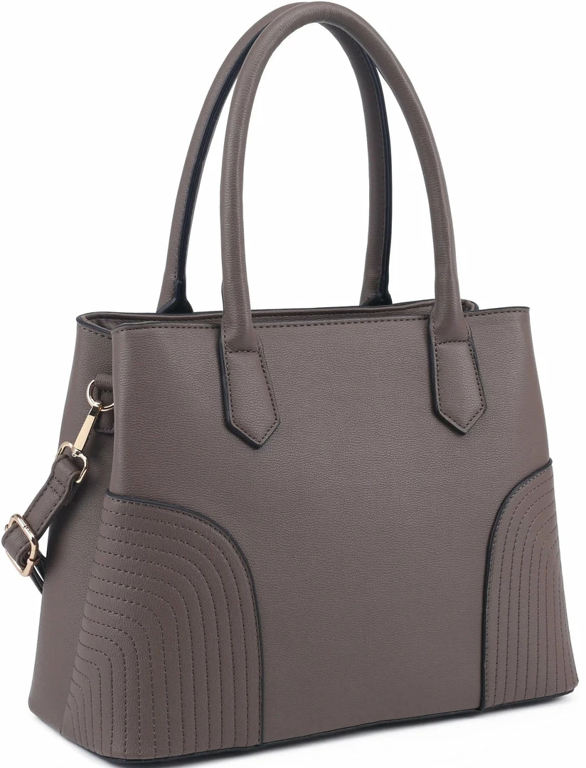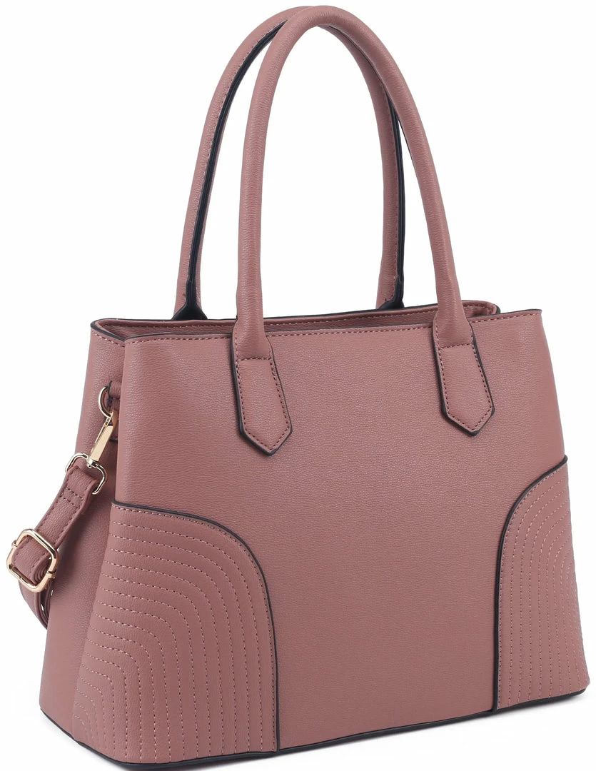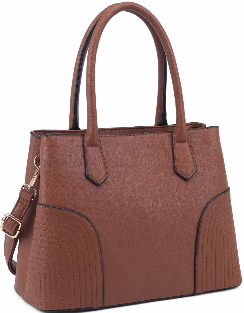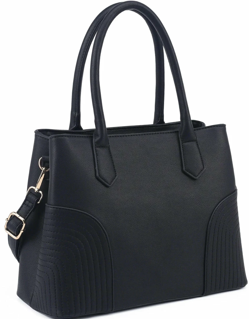 Corner design structured handbag featuring a double zipper top, back zipper pocket, and adjustable crossbody strap.