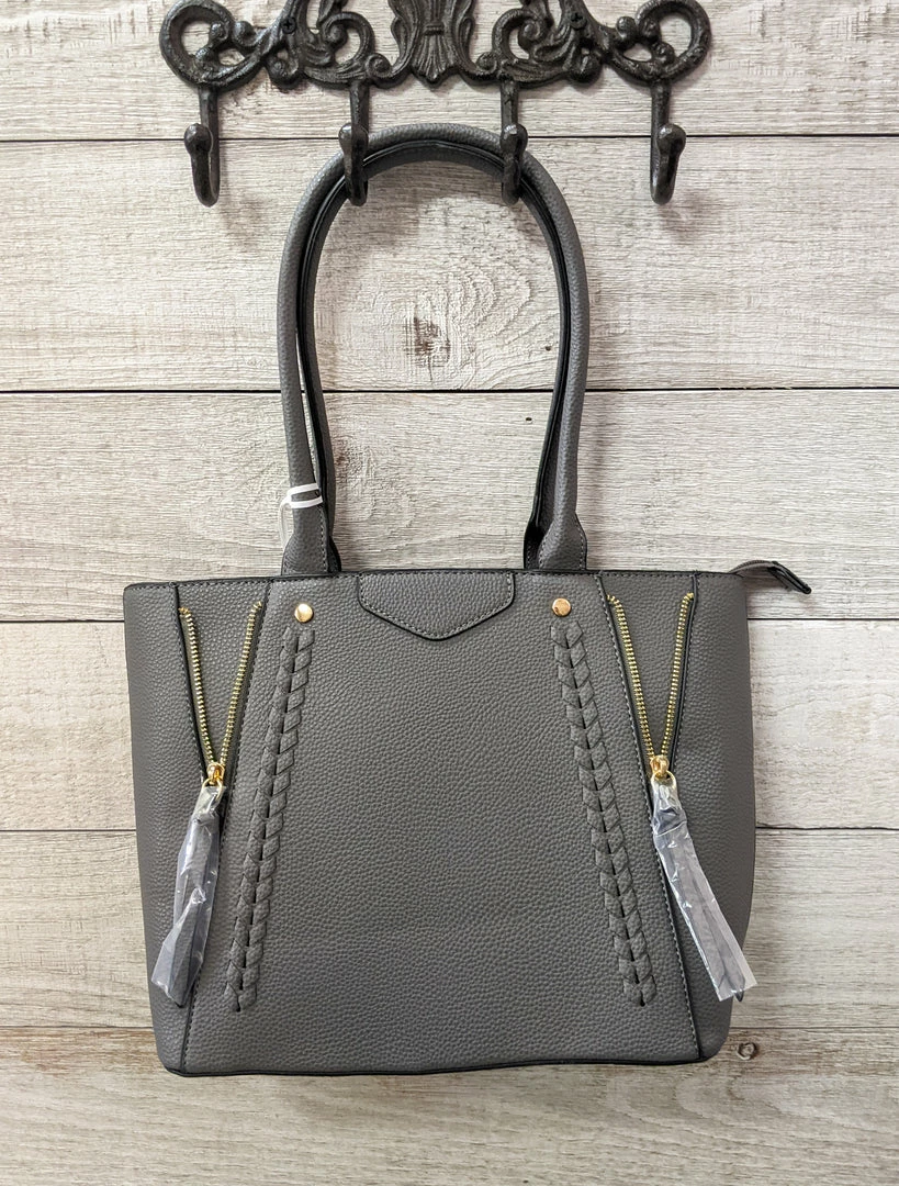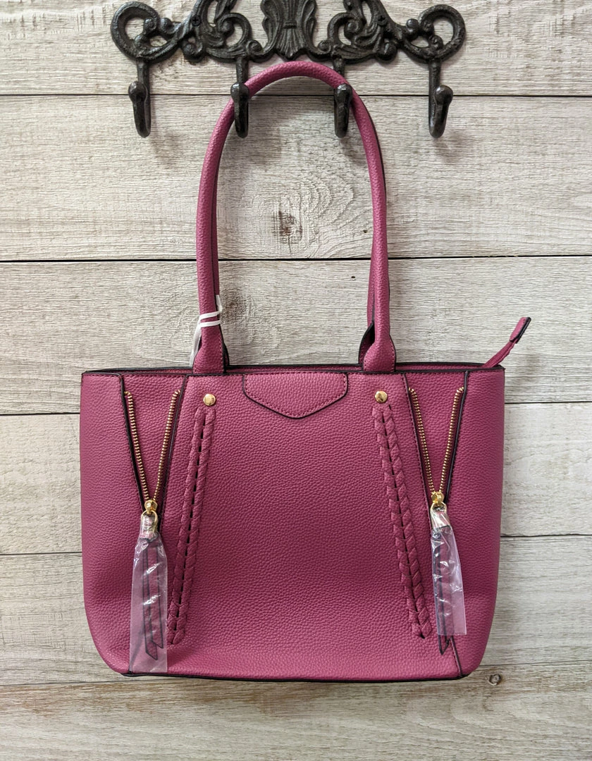 Tote purse with two handles, braided design on front with two zipper detail and zippered top closure.