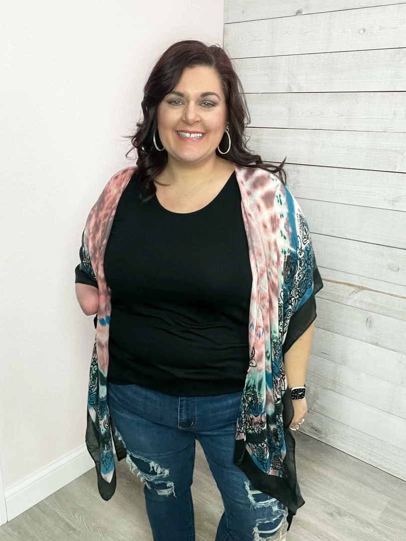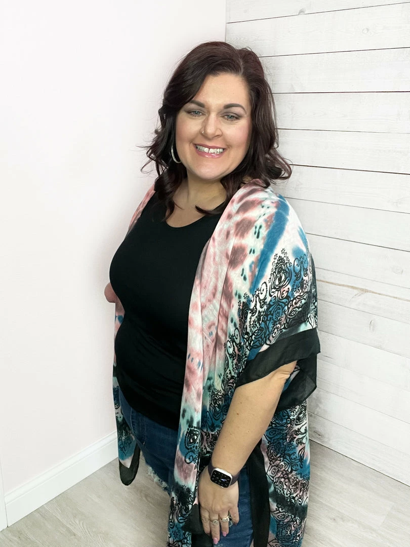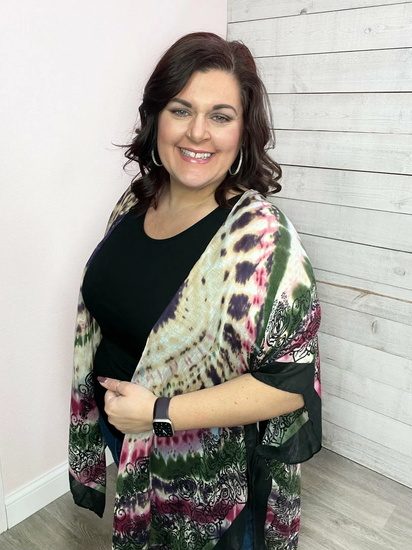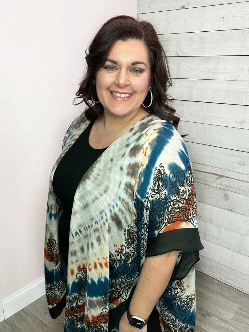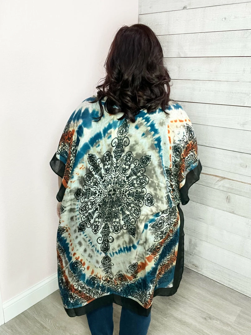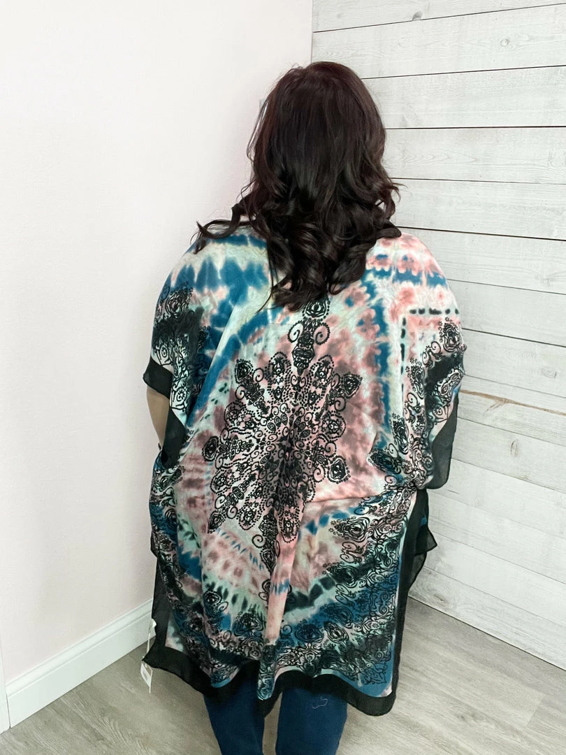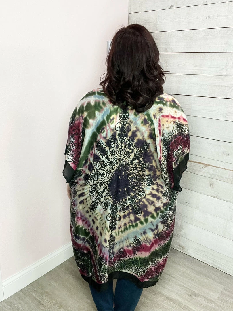 Lightweight tie-dye kimono featuring short sleeves and side slits. One size fits all.