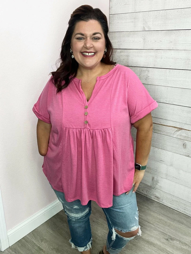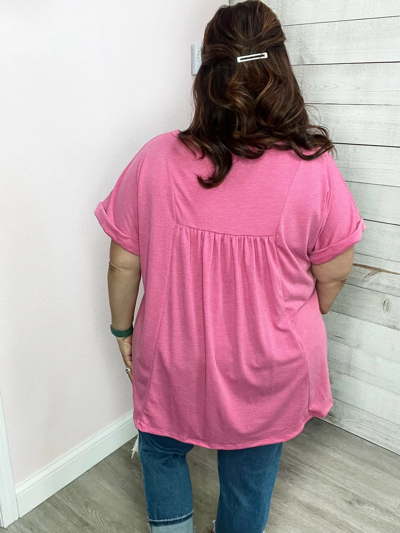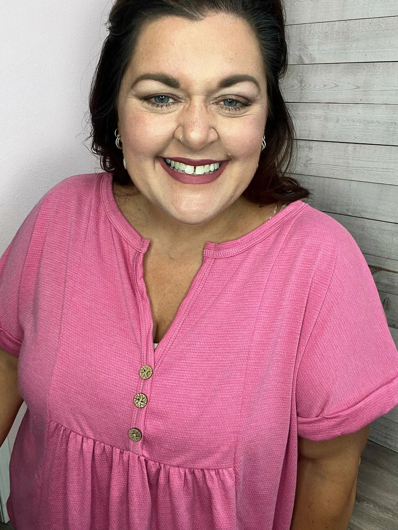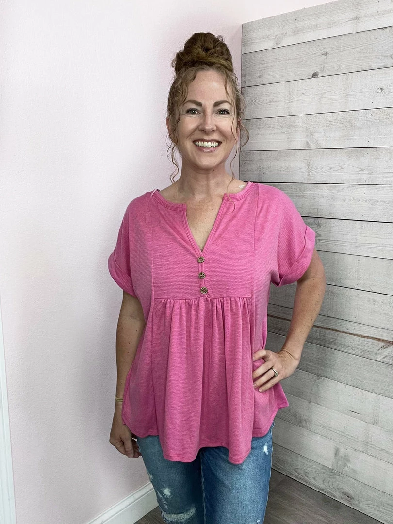 Solid pink top featuring short cuffed sleeves, V neckline with faux button detail, and a hi-low flowy hemline. Go down a size.Â