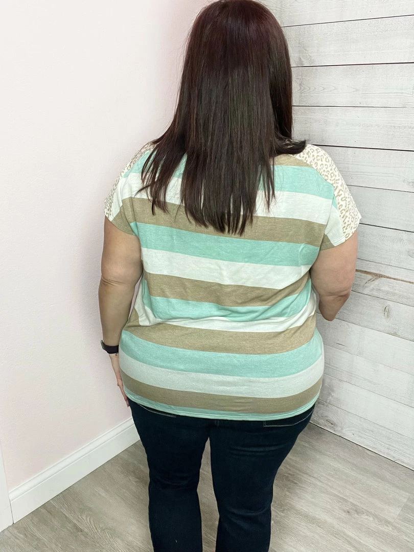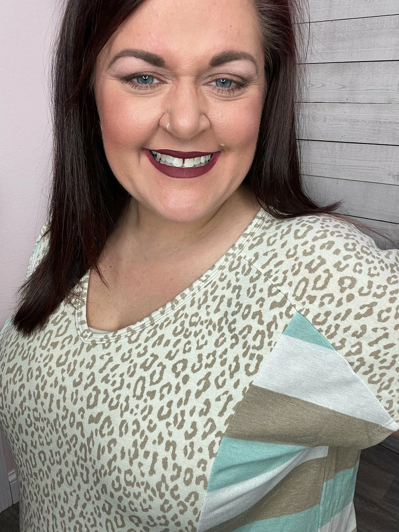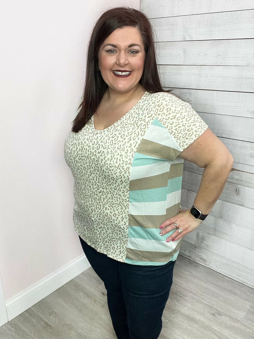 Fun color block top featuring an animal print down the front and stripes down the side and back. Also features a V neckline, short sleeves, and a straight hemline. True to size!