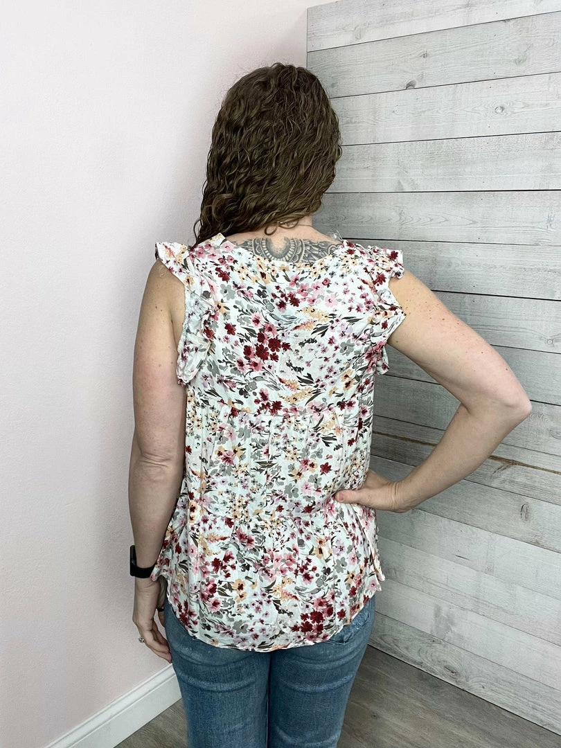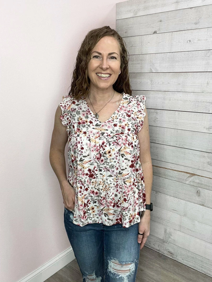 Tiered babydoll top with floral printed all over this top! Flutter sleeves, V neckline, empire line with a flowy fit. Non-sheer, woven. True to size!