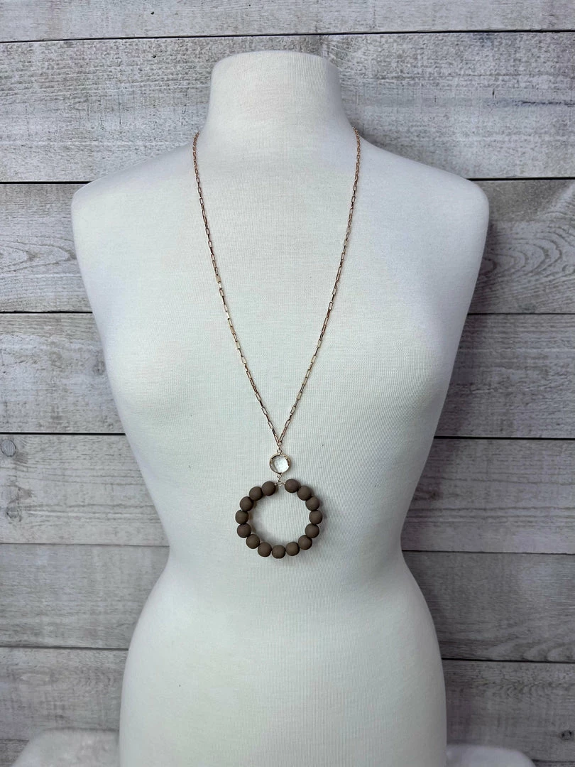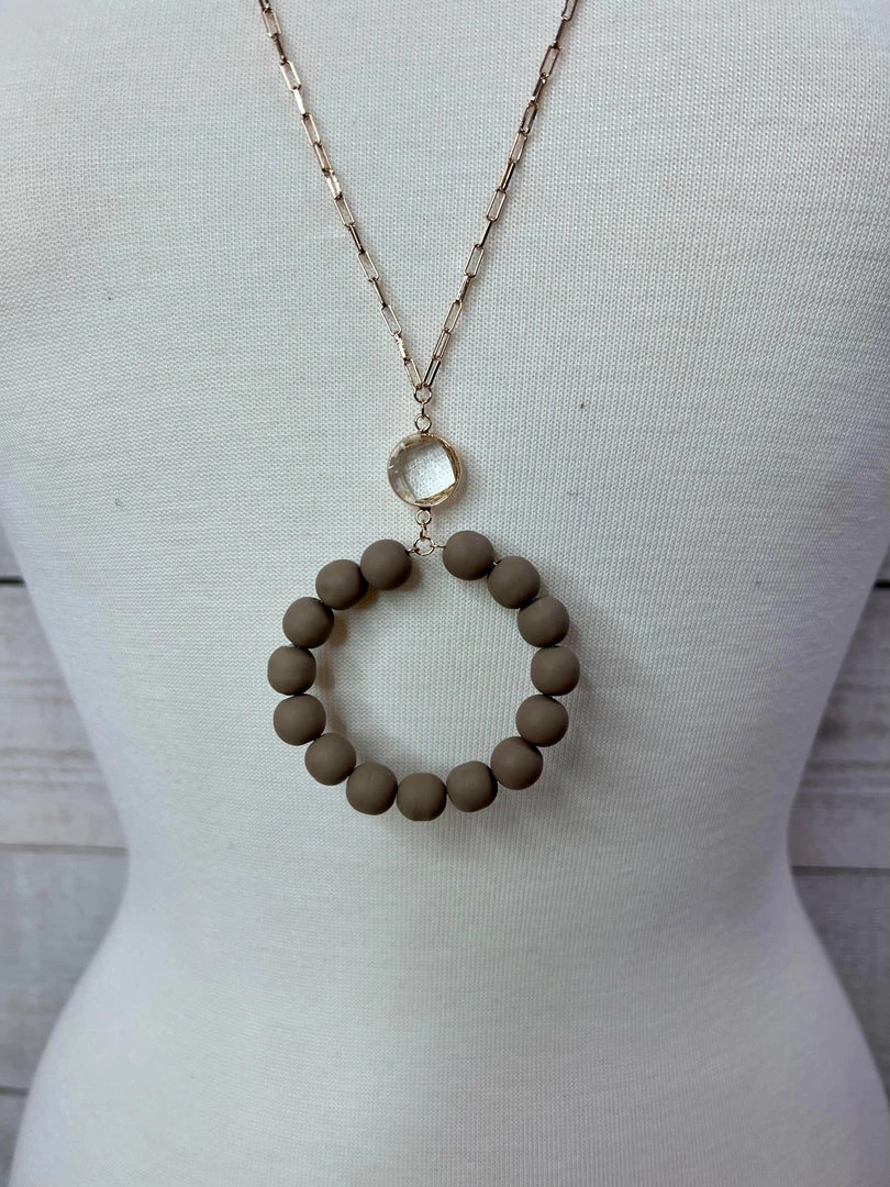 Long gold chain necklace with a grey clay beaded circle. Comes with gold ball stud earrings.
