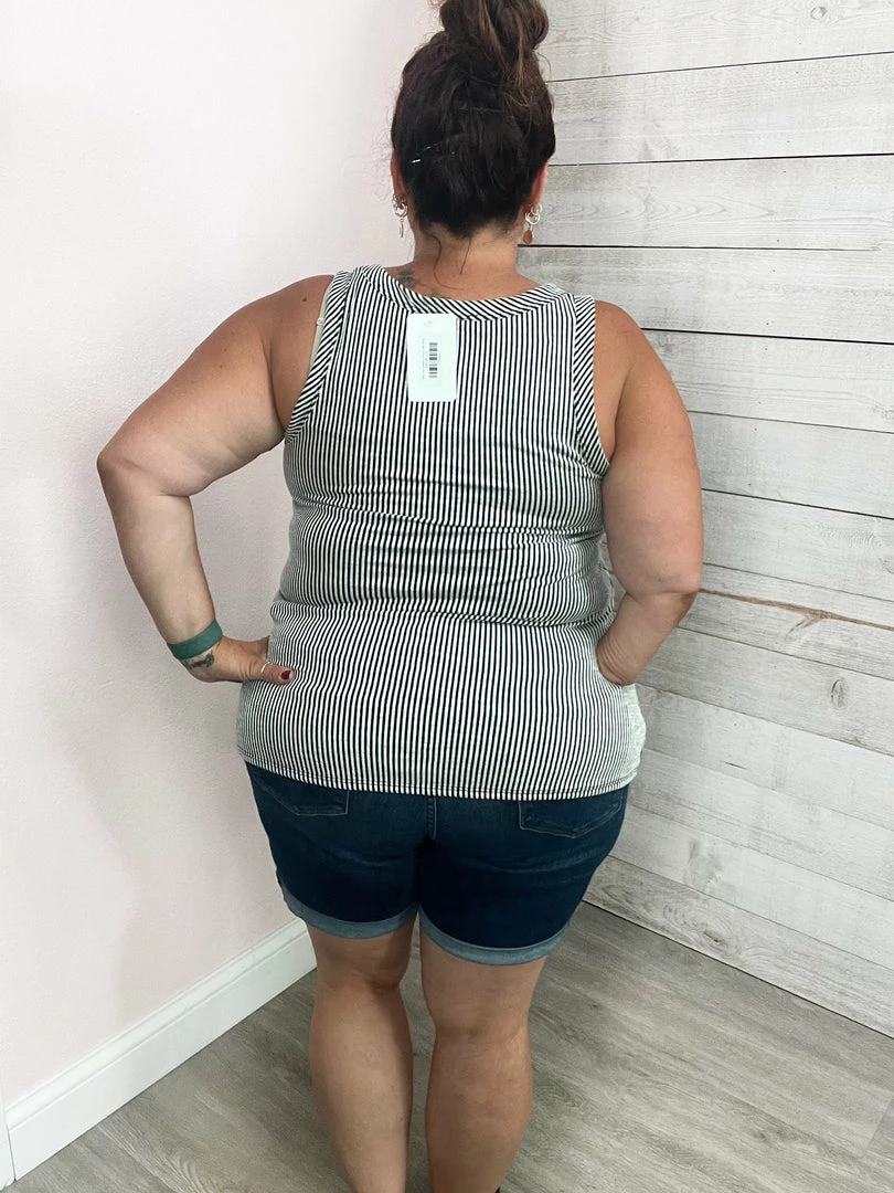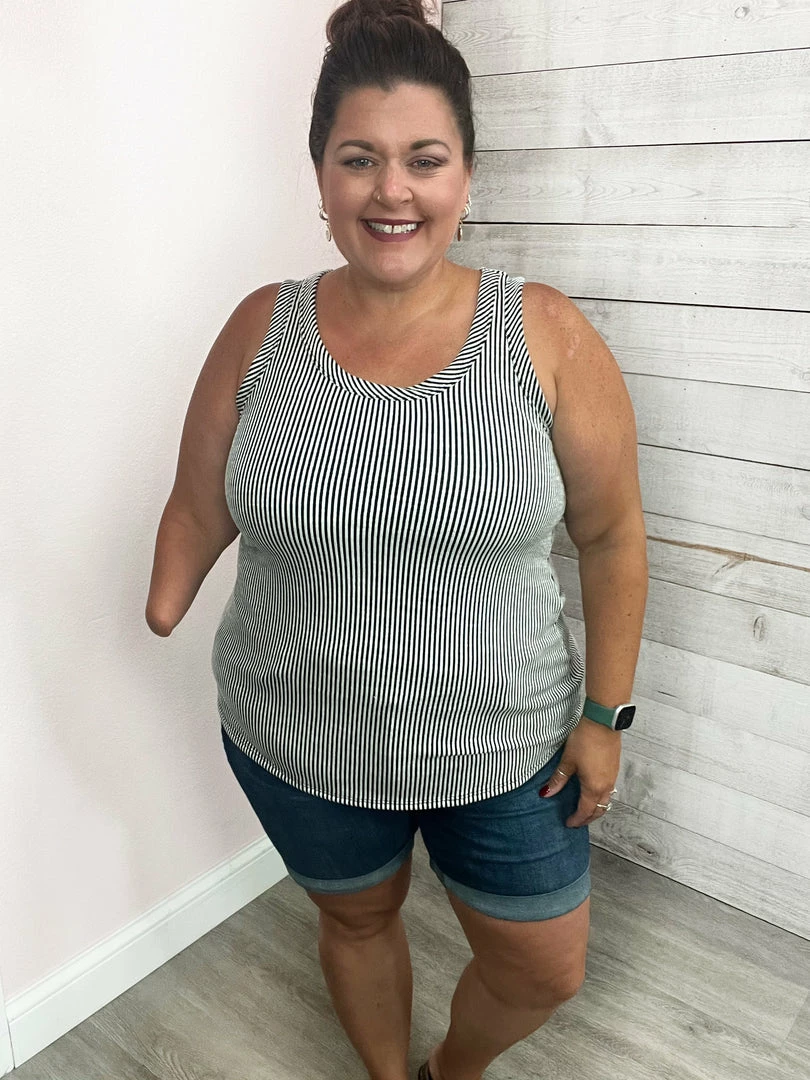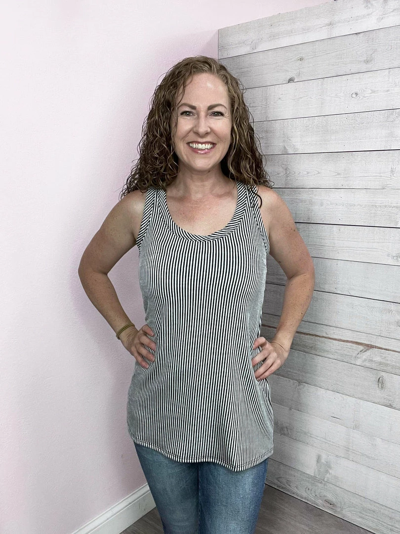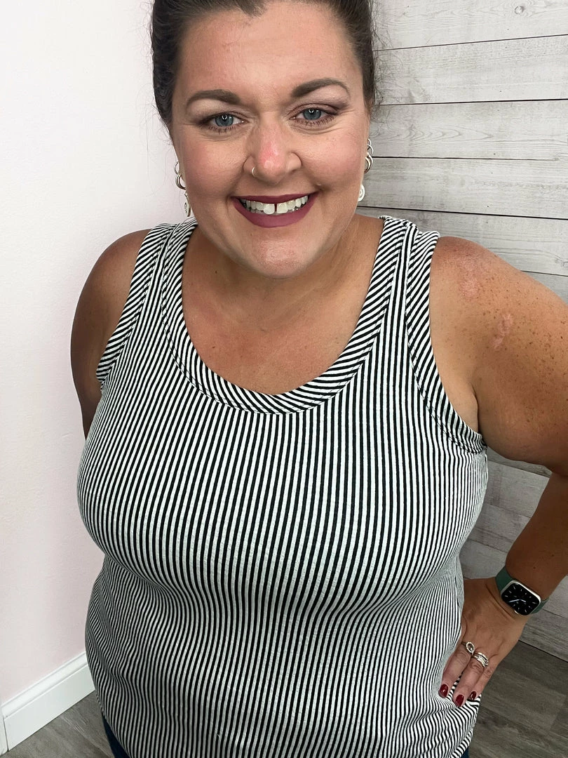 Black and white striped tank top featuring a round neckline and a straight hemline. Ribbed texture. True to size!