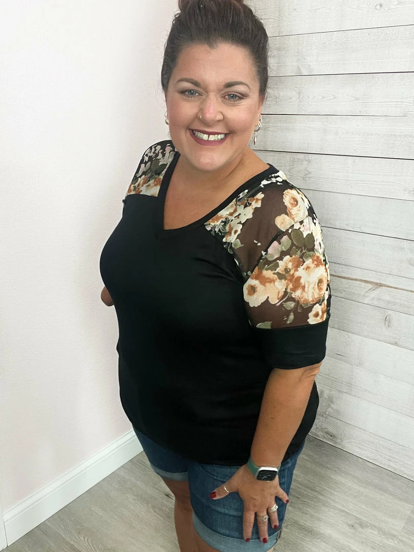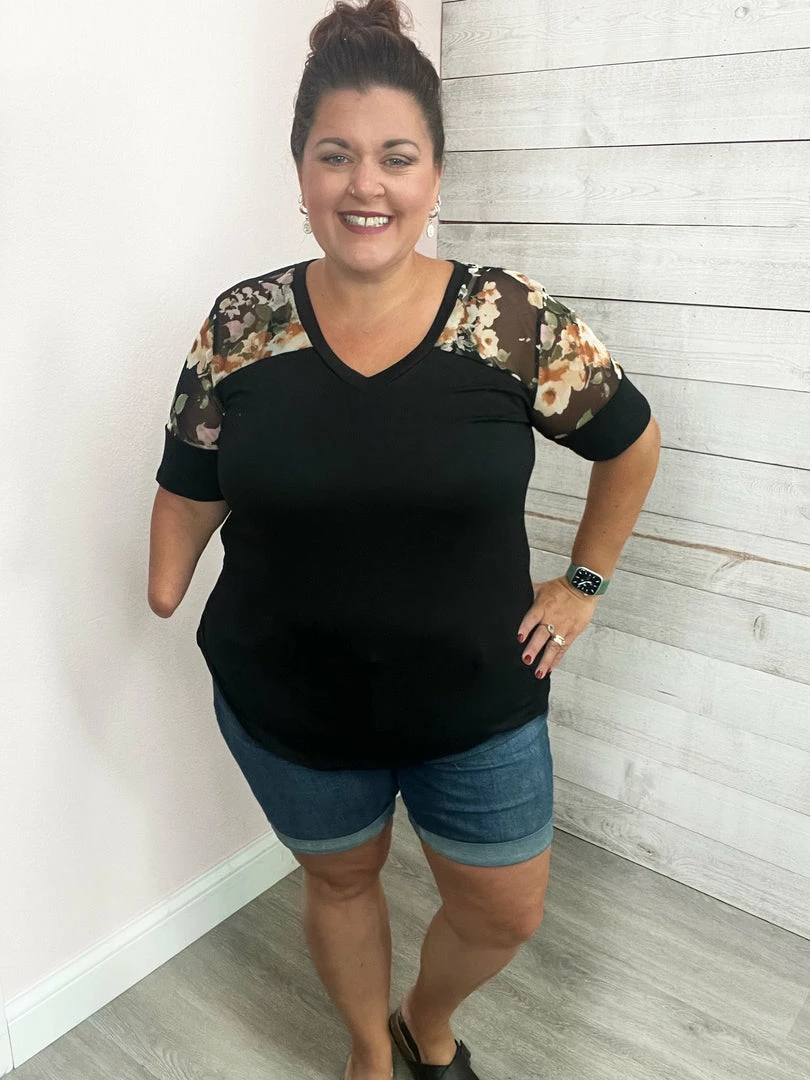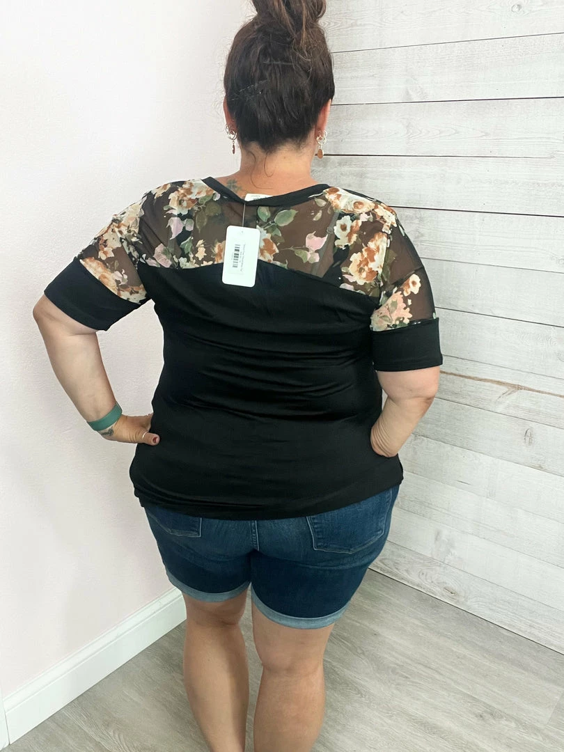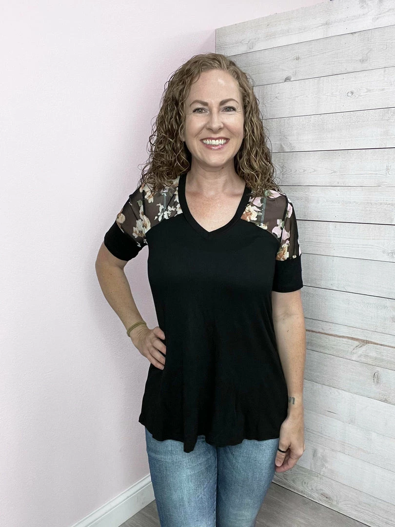 Black short sleeve top with contrast floral mesh on the upper part. Features a V neckline and straight hemline. True to size!