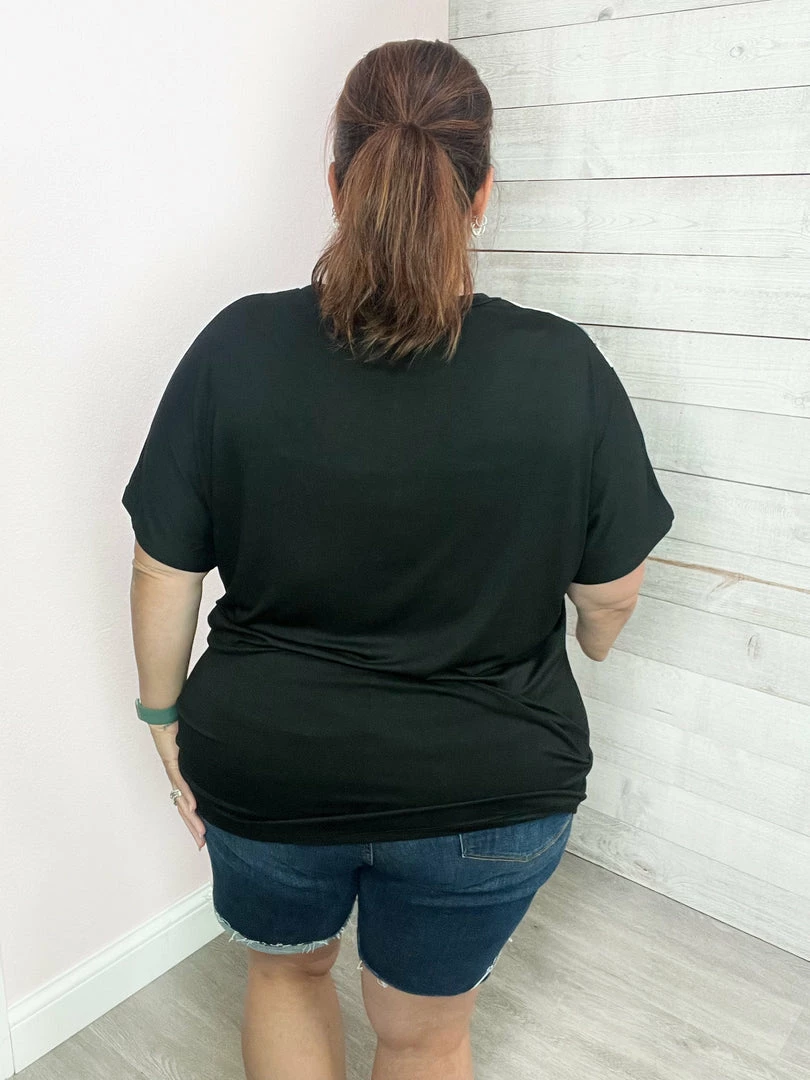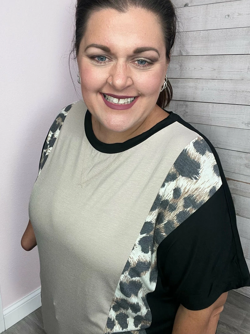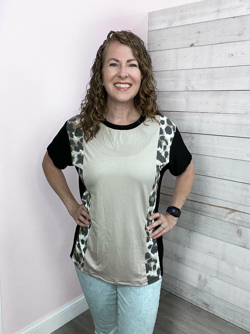 Not only is this top super soft it is also super stylish! Featuring the popular color block style with leopard, black, and taupe, a round neckline, and a straight hemline. True to size.