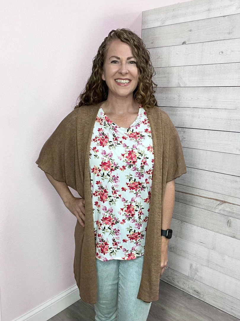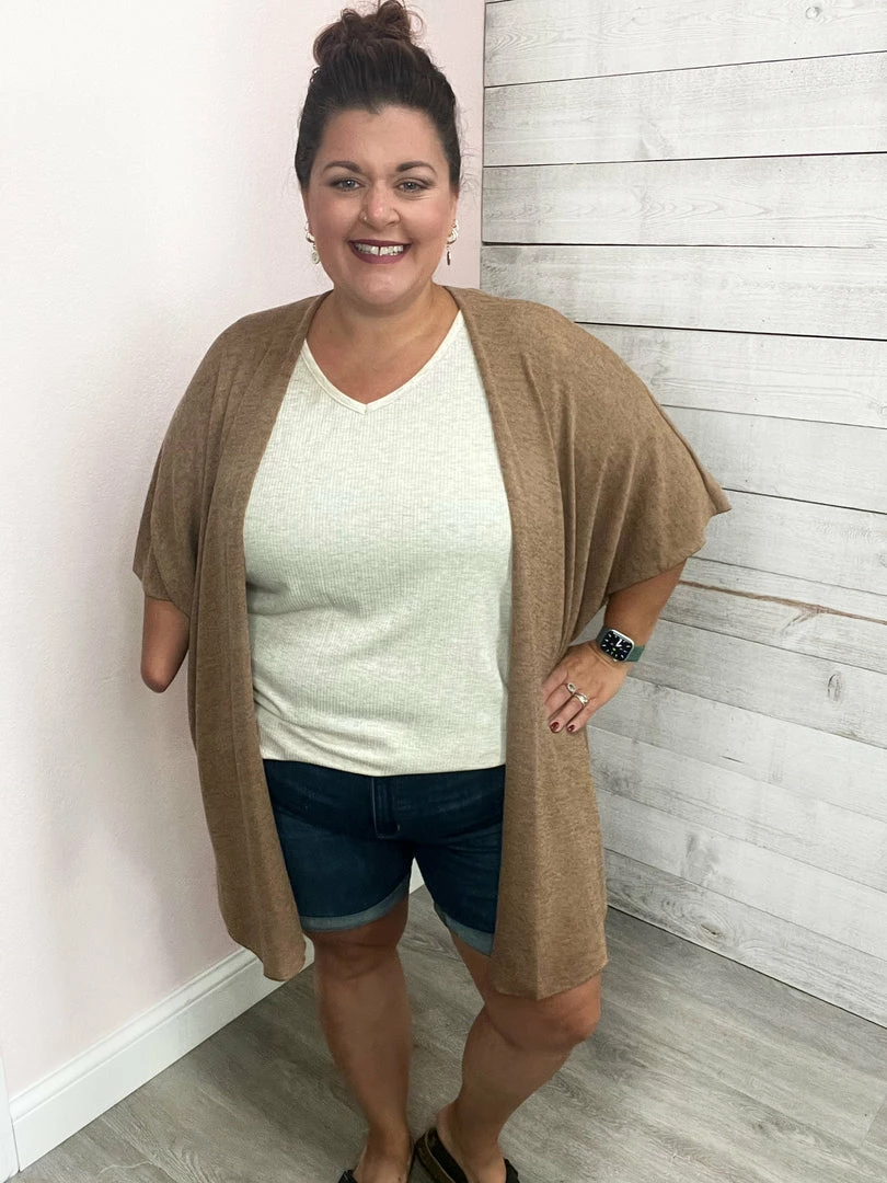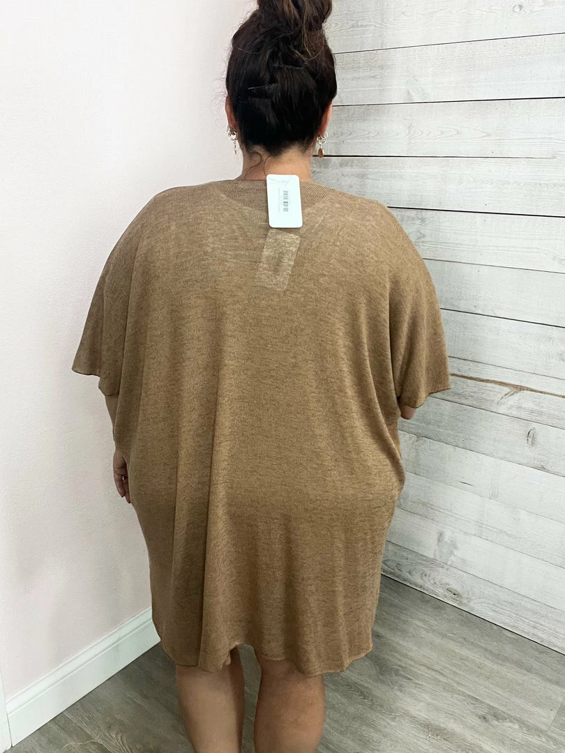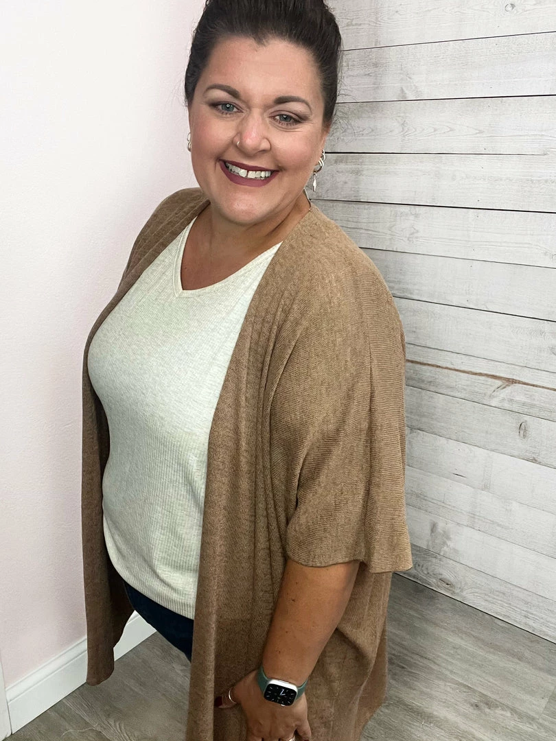 Mocha color loose-knit kimono. The flowy fit has an elegant drape and will be a great way to elevate your outfit! True to cardigan size. Medium fits 12-14,large fits 14-16, and XL fits 16+.