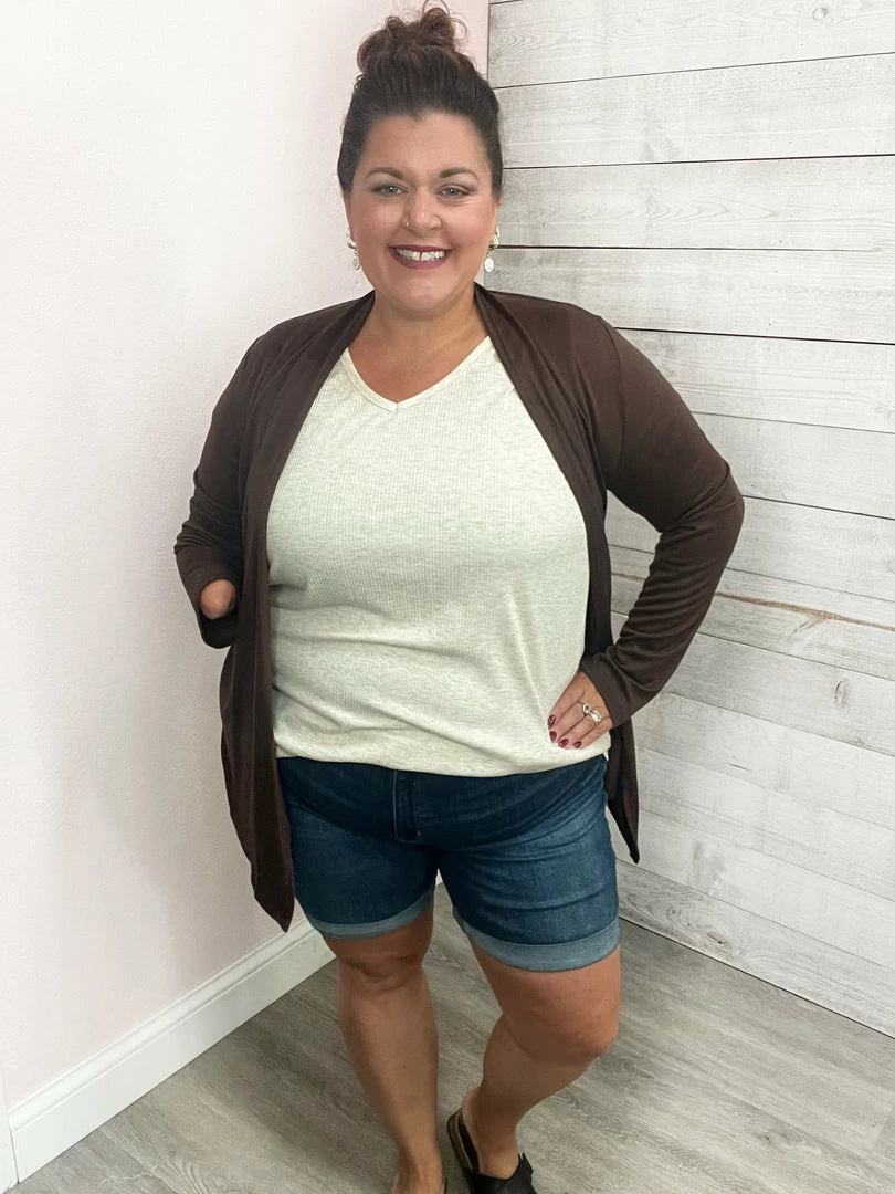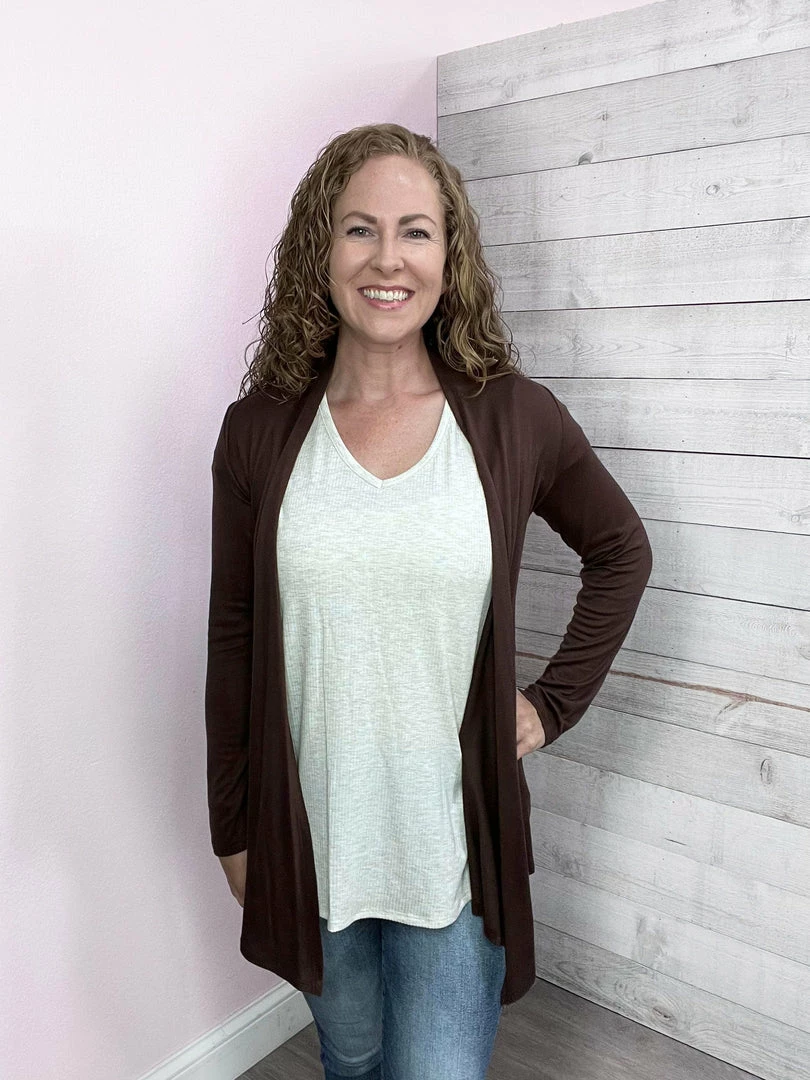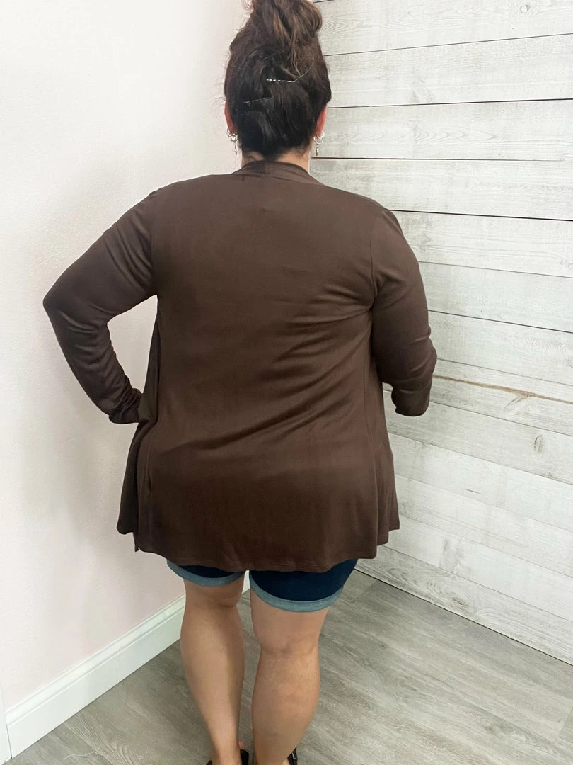 Brown long sleeve soft cardigan with a draped open front. True to cardigan size. Small fits 0-10, medium fits, 12-14, large fits 16+.