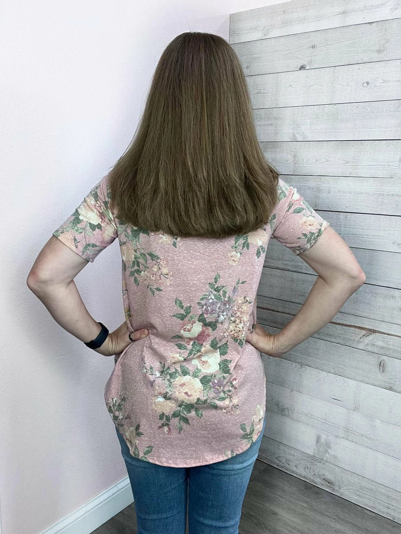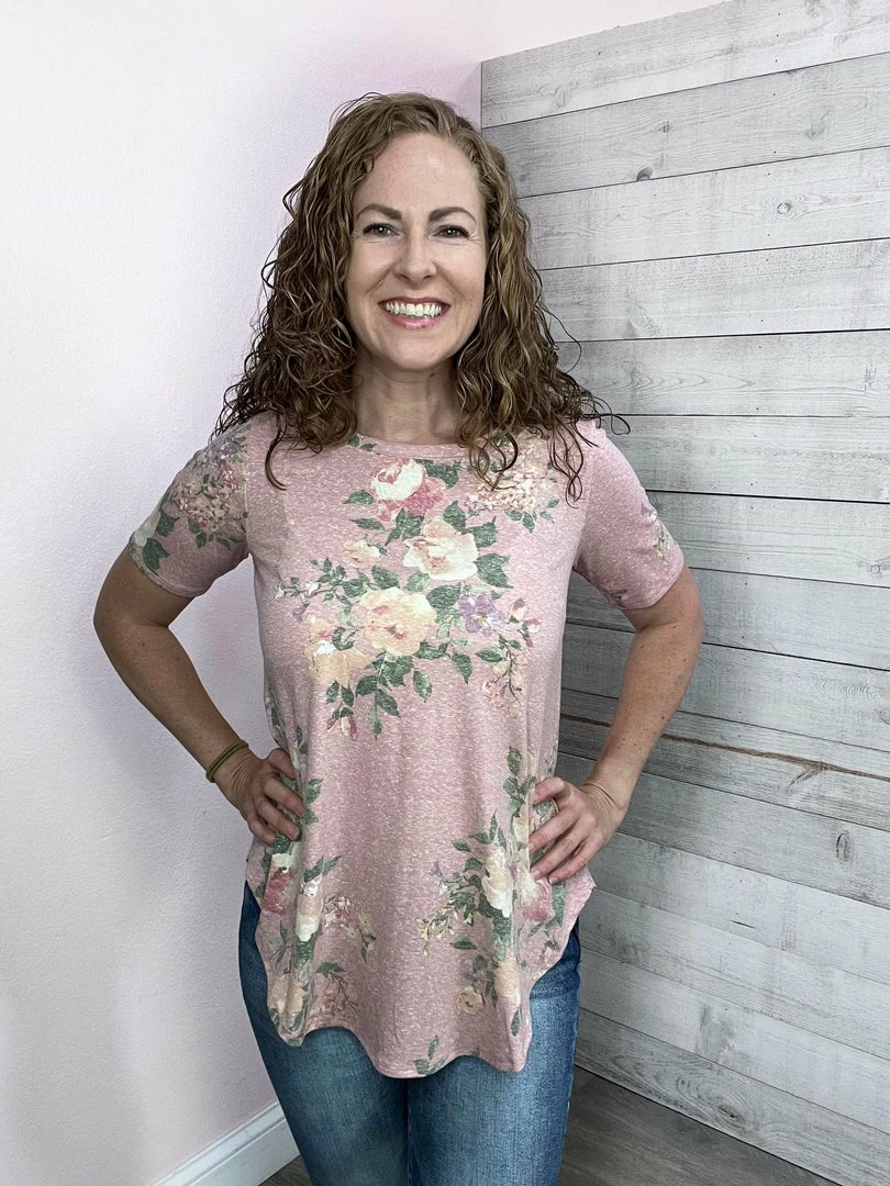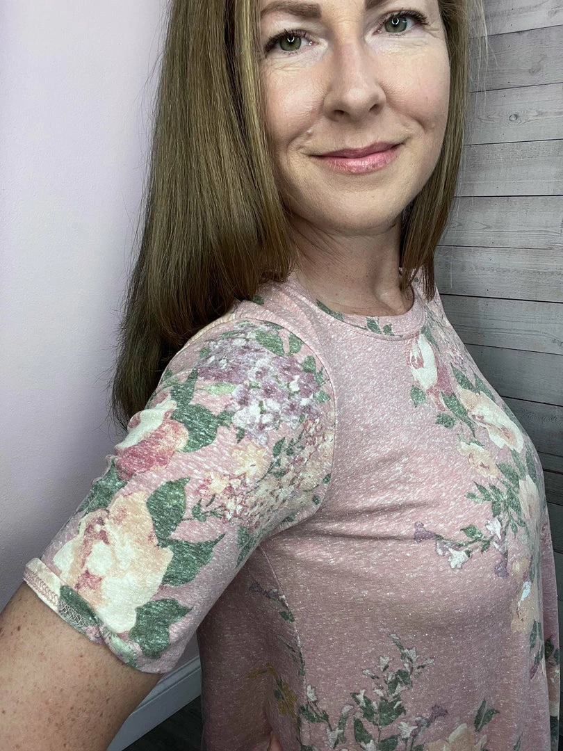Pink top with peach floral print features short sleeves top, a round neckline, and a hi-lo dolphin hem. True to size.