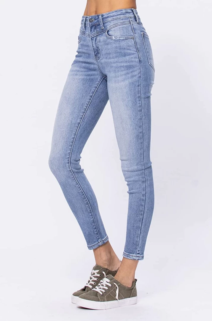 Light Blue, no distressing, high-rise front yoke skinny jeans. True to size.