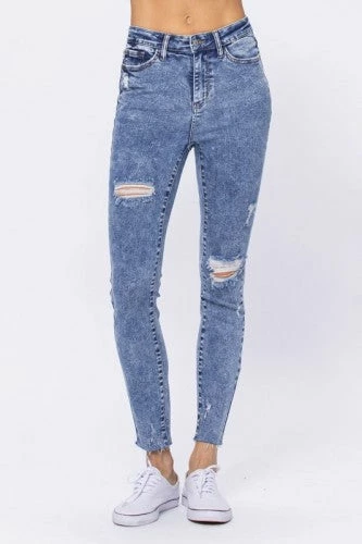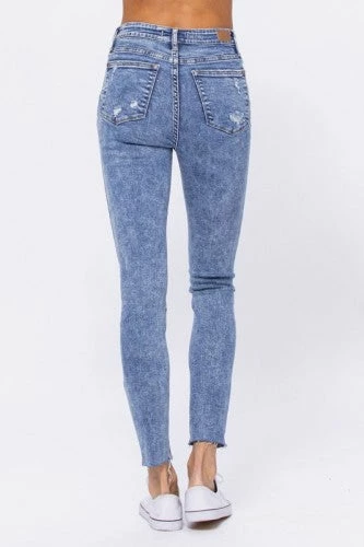 Super trendy acid wash skinny jeans with distressing. High-rise and raw hem. True to Judy Blue size.