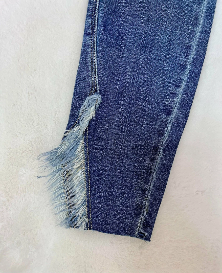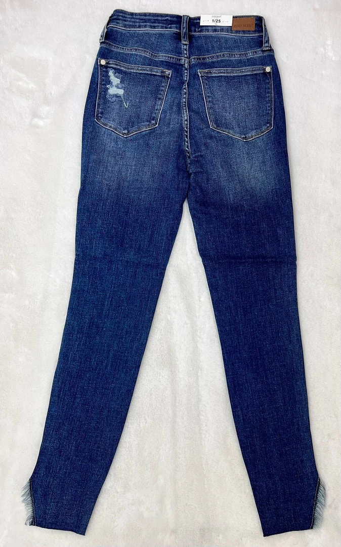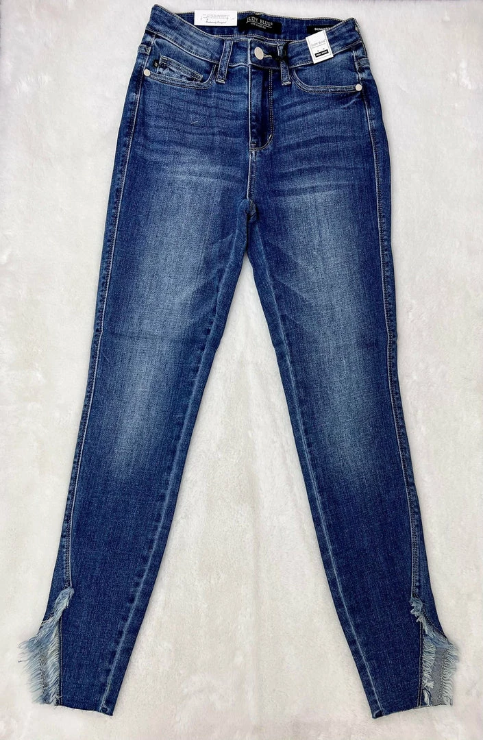 Judy Blue high waist skinny jeans with a raw hem and fringe detail. Medium wash. Small distressing on back pocket.