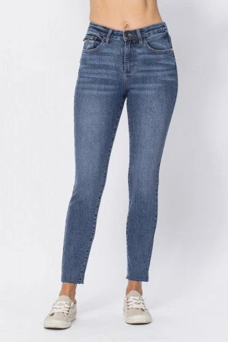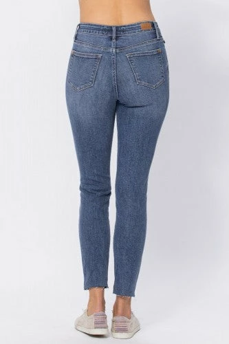 Judy Blue high-waisted embroidered pocket relaxed-fit jeans. Medium Wash with raw hem and NO distressing.