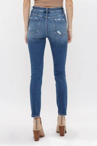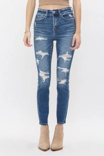 Mica Denim high rise ankle skinny with distressing. Comfortable and stretchy fabric. Medium Wash.