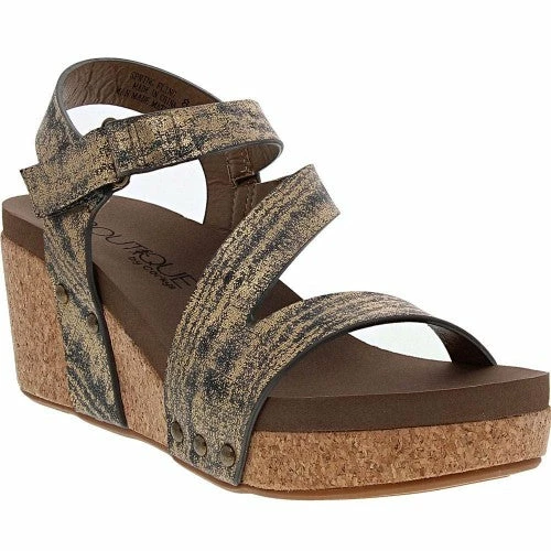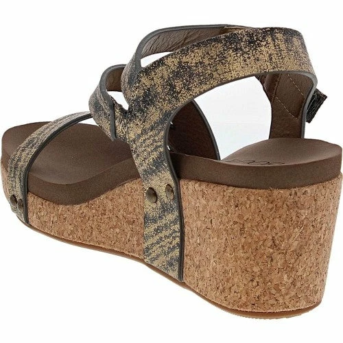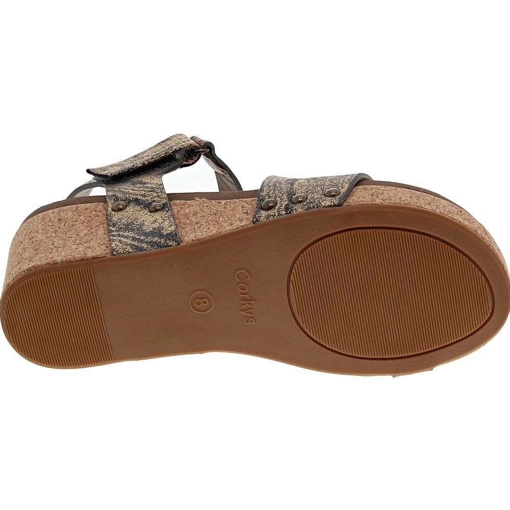 Boutique by Corkys wedge sandal featuring faux leather upper straps with a hook and loop closure and a lightly cushioned footbed with a cork platform. The color is Gun Metal Gold. True to size. Go up to the next size if you wear a half size.