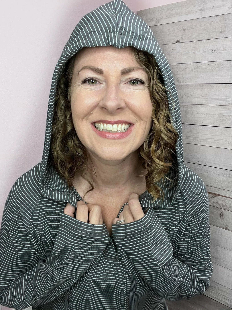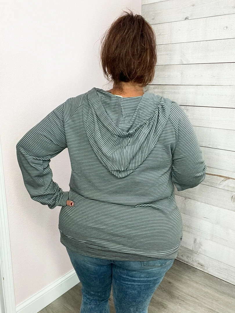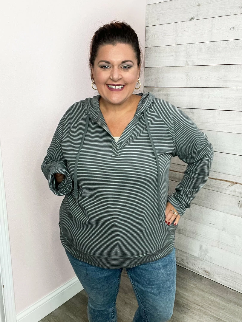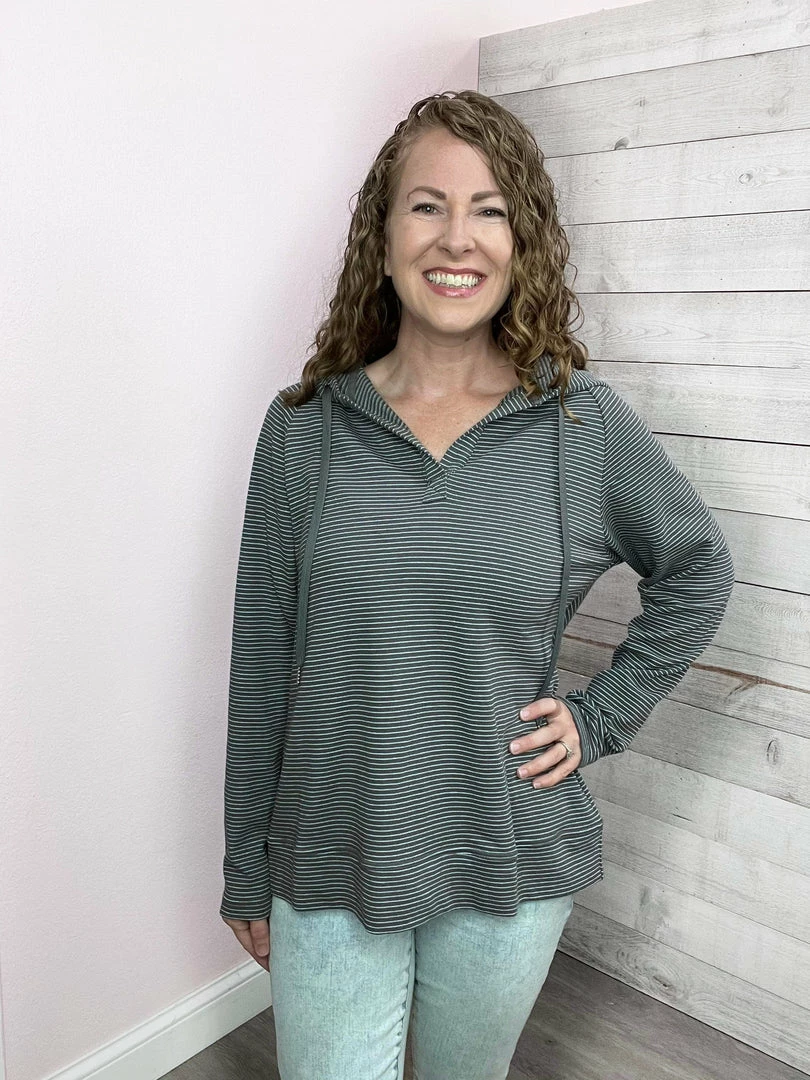 Cotton french terry striped top featuring long sleeves, drawstring hood, V neckline, and a high-low hemline. True to size.