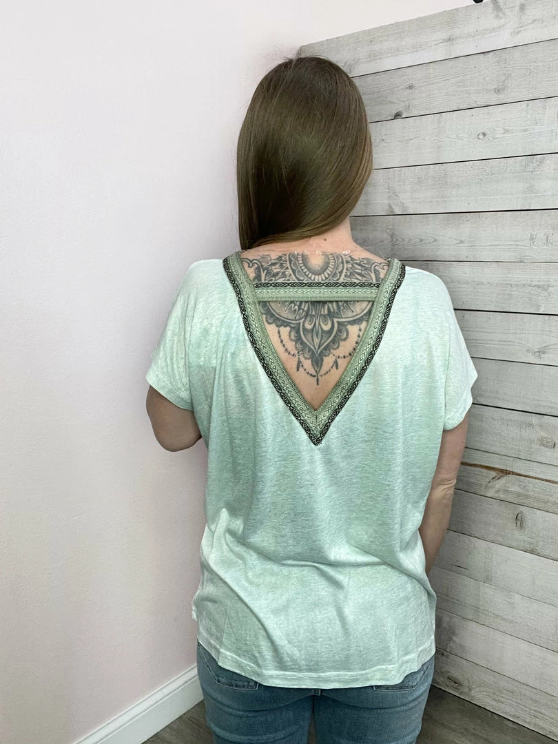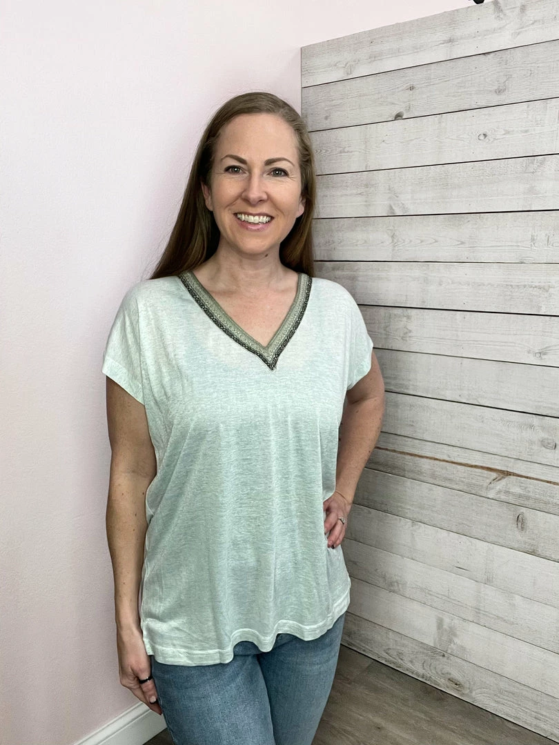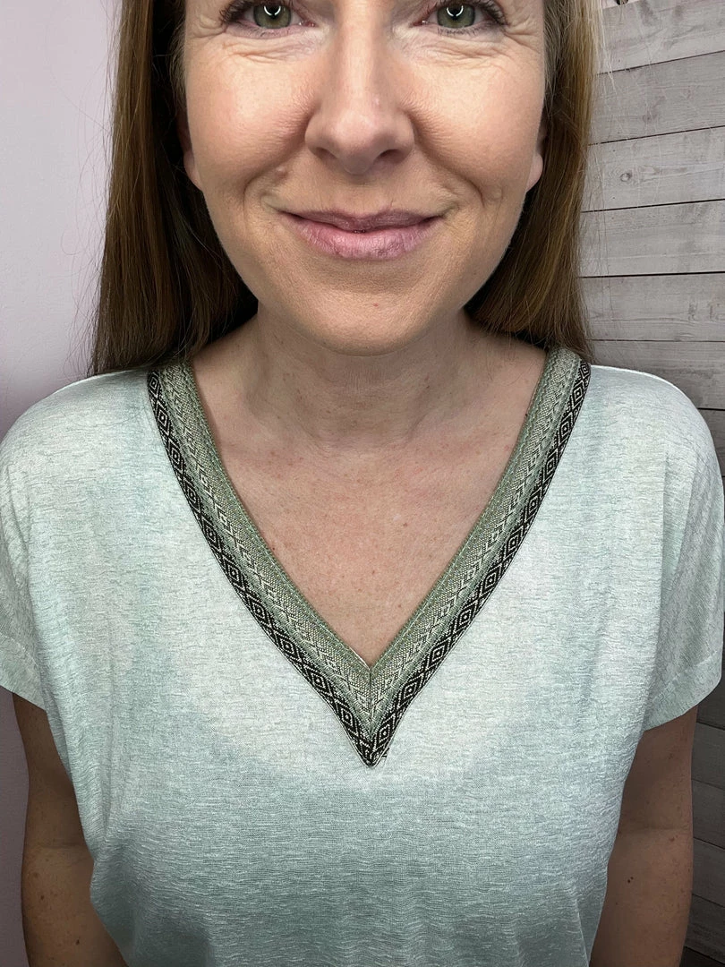 This lightweight sage top features a V neckline on the front and back with beautiful tribal trim, short sleeves, a relaxed fit, and a straight hemline. True to size!