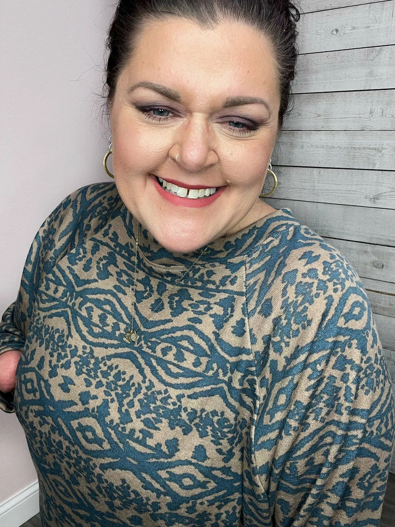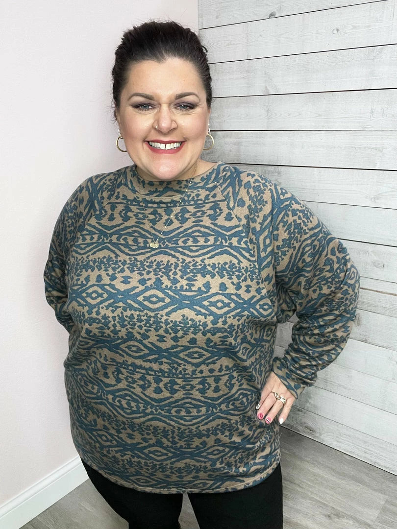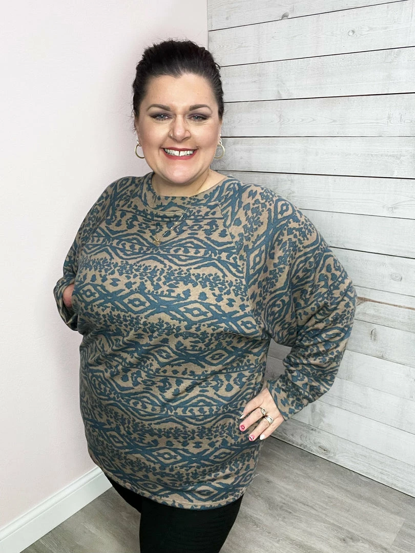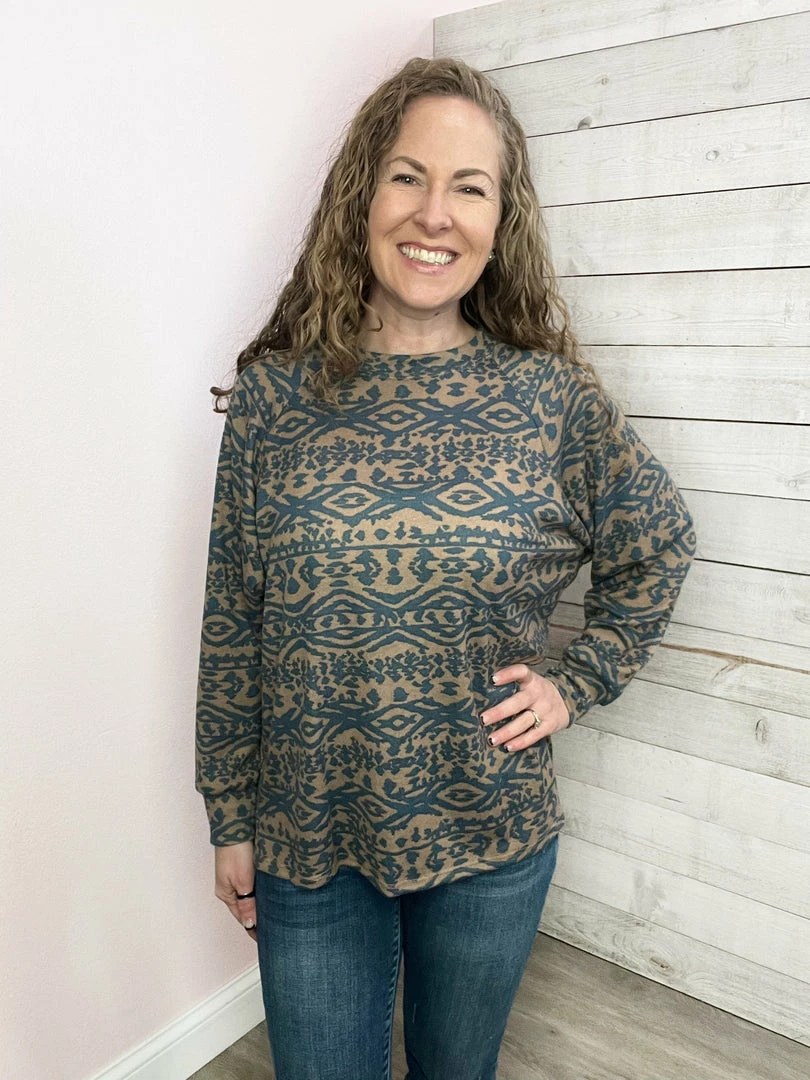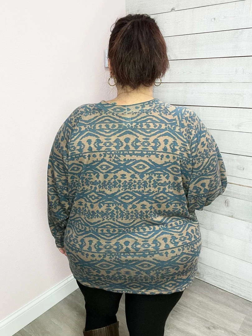 Tribal print top featuring raglan long sleeves and round neckline. Relaxed fit. The colors are Tan and Blue. True to size.