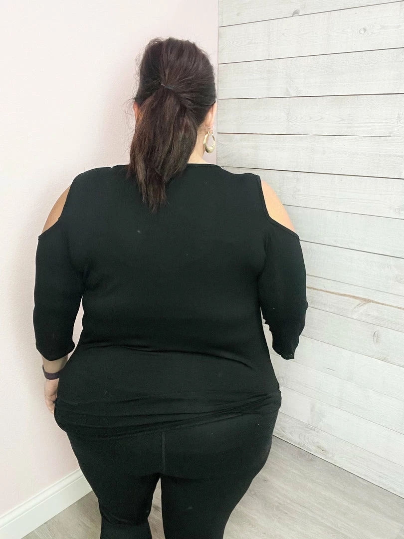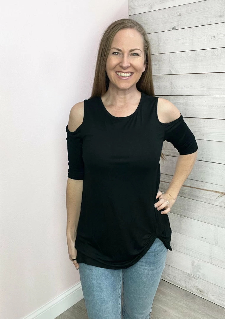 Solid jersey cold shoulder top featuring 3/4 sleeve, twisted front bottom, and a round neckline. Comes in two colors Black or Pink! True to size!