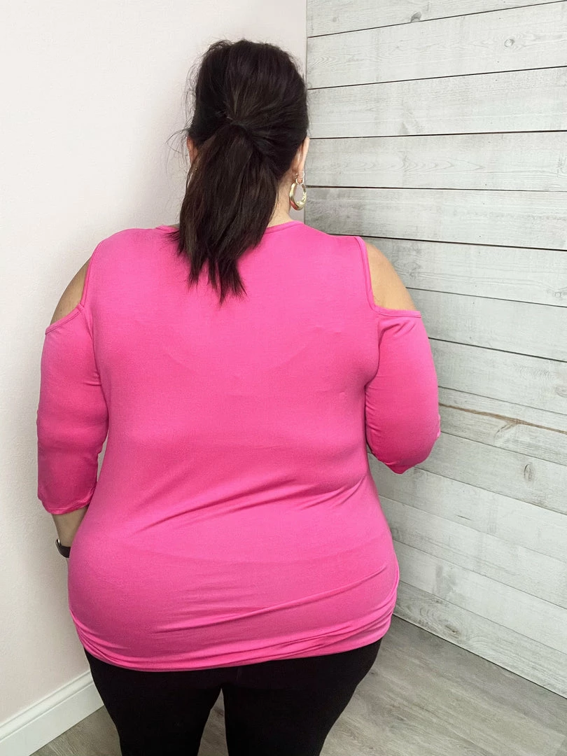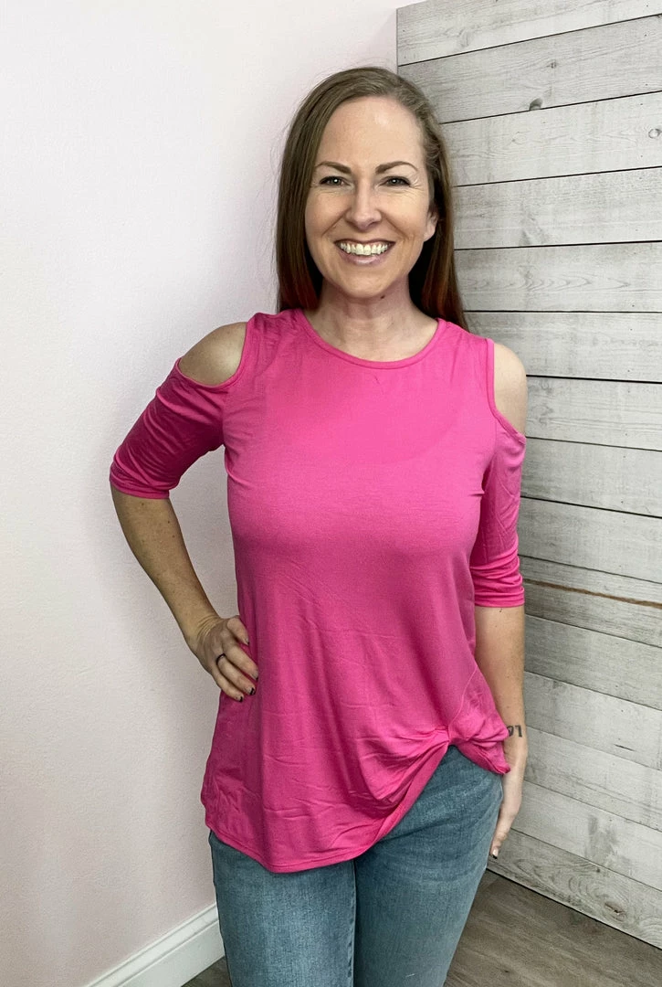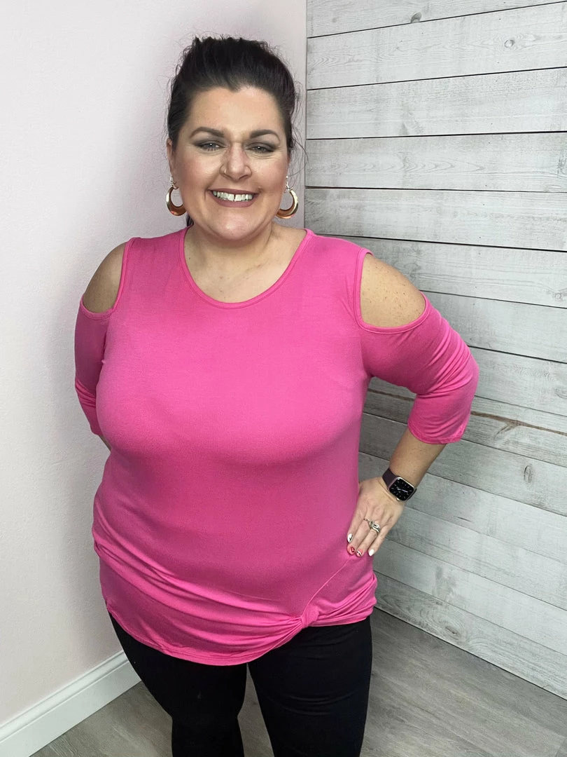 Solid jersey cold shoulder top featuring 3/4 sleeve, twisted front bottom, and a round neckline. Comes in two colors Black or Pink! True to size!