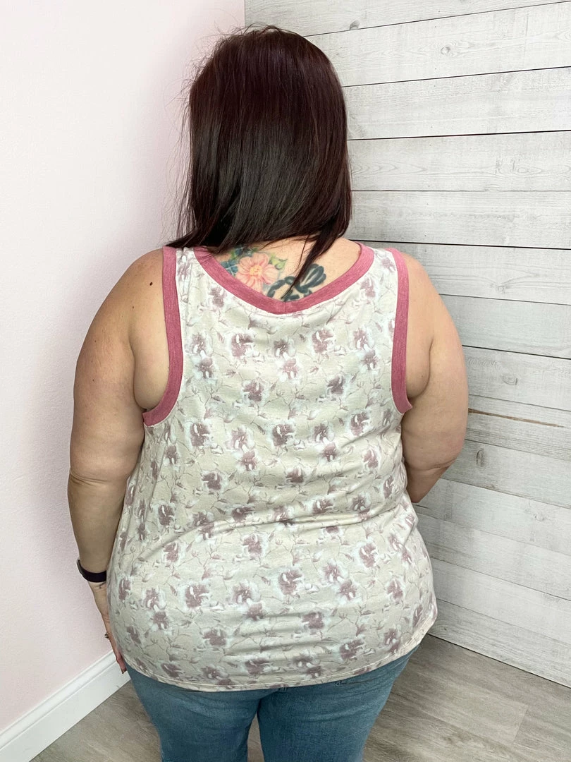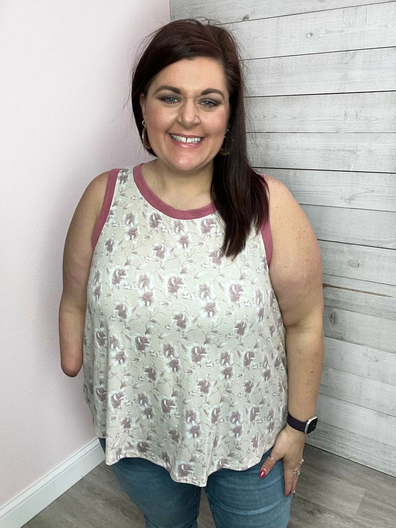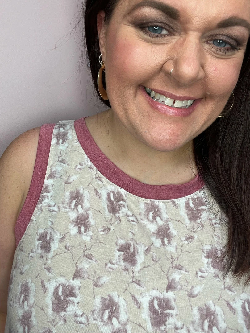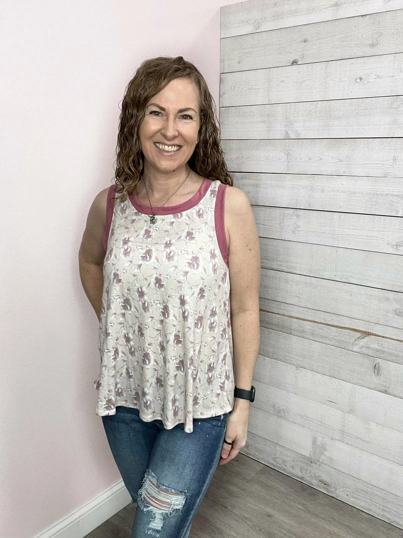 Floral relaxed fit tank with solid pink trim. True to size.