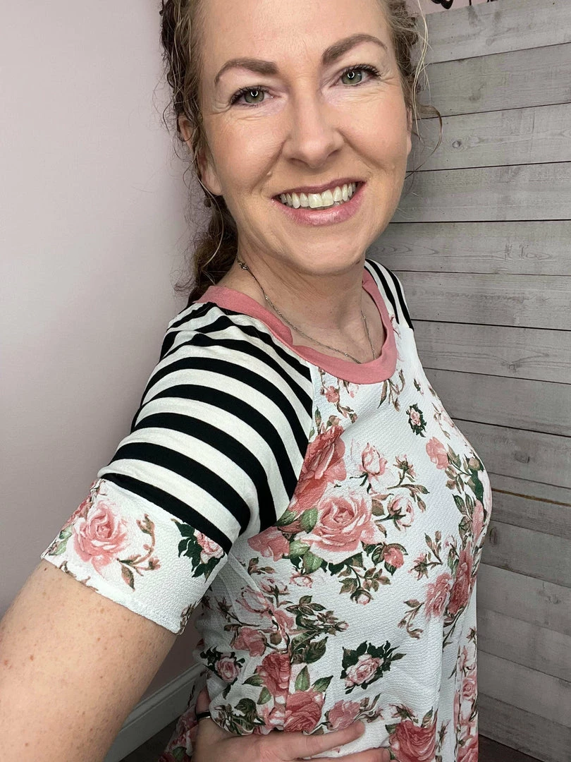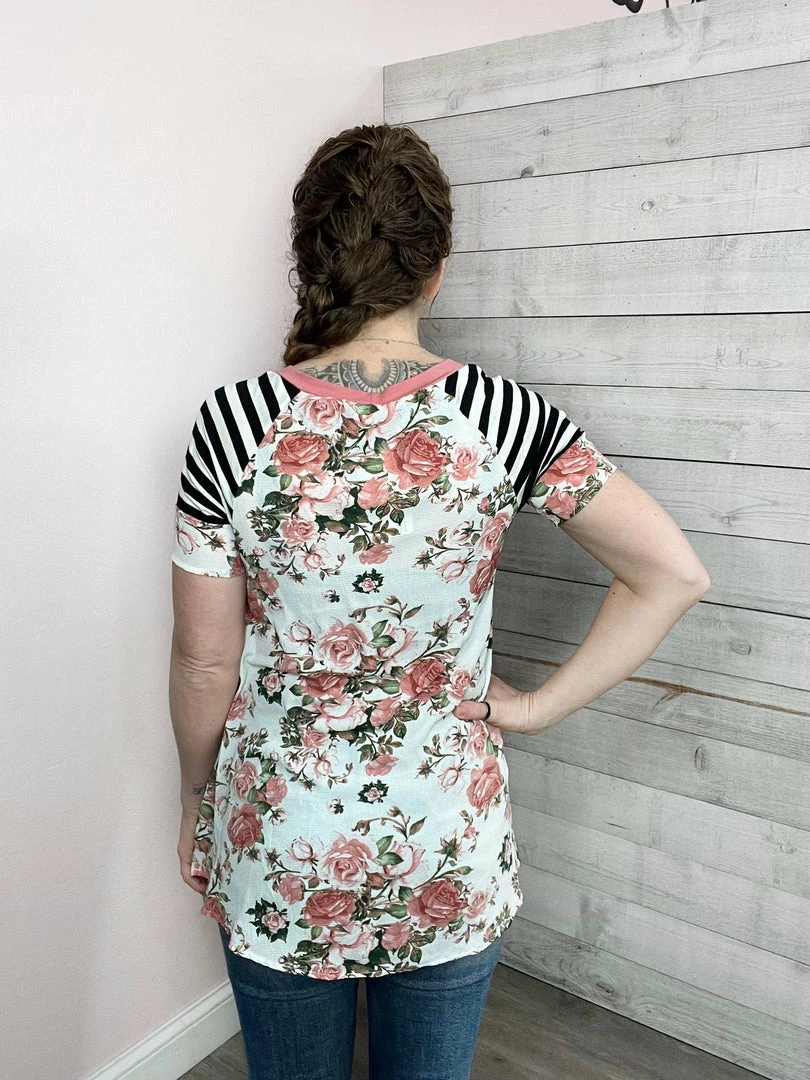 Floral print top with stripe short sleeves. Round neckline and dolphin hemline. True to size!