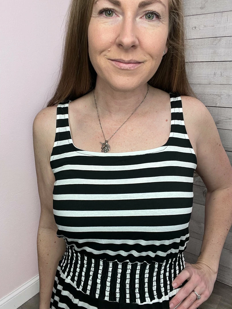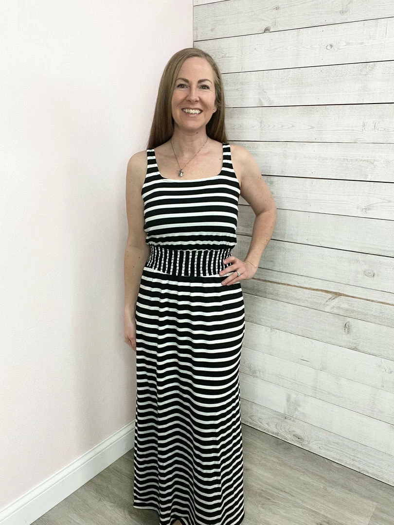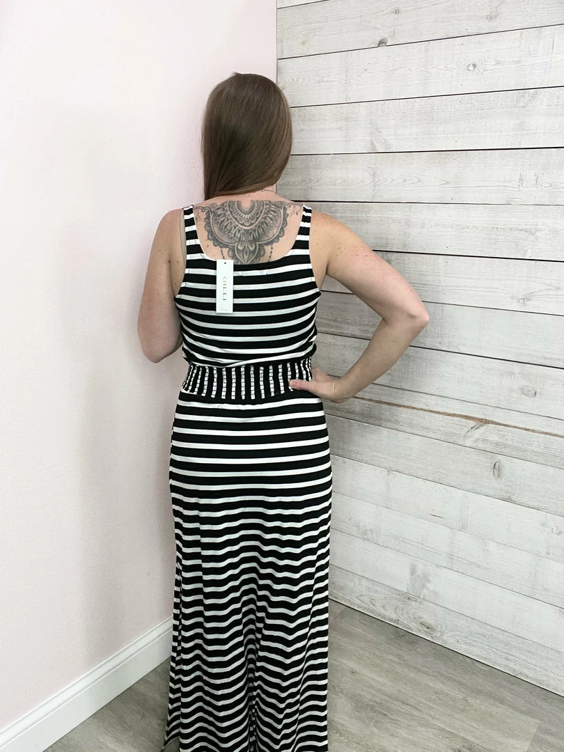 Black and white striped maxi dress featuring a scoop neckline, smocked elastic waist, skirt liner, and one side slit. True to size!
