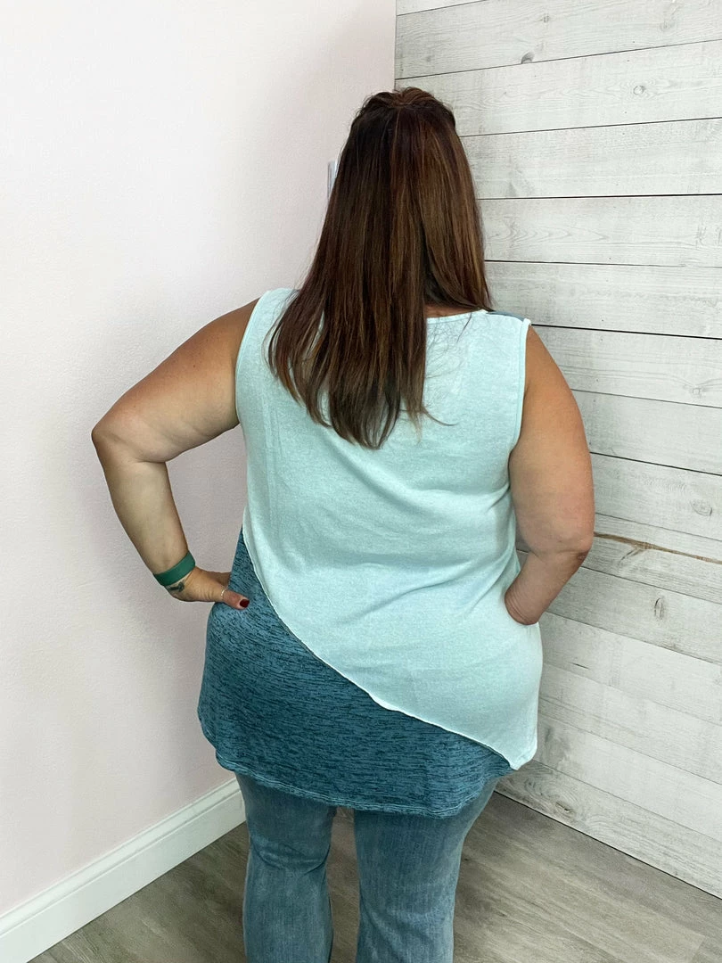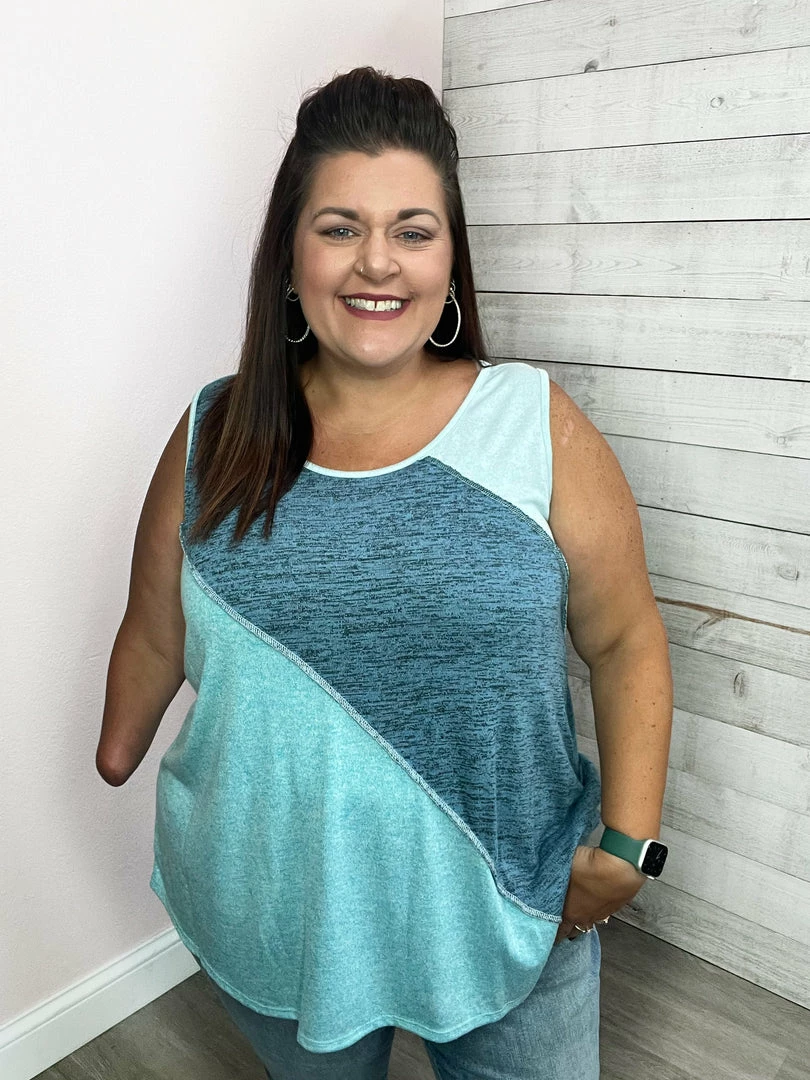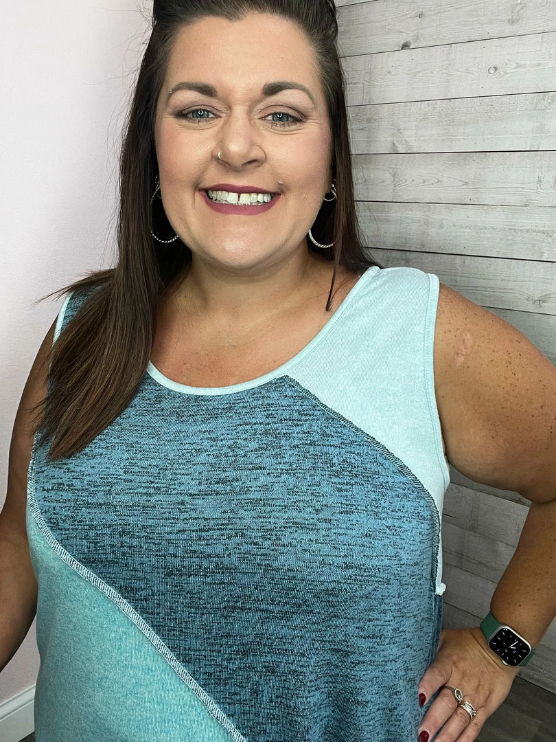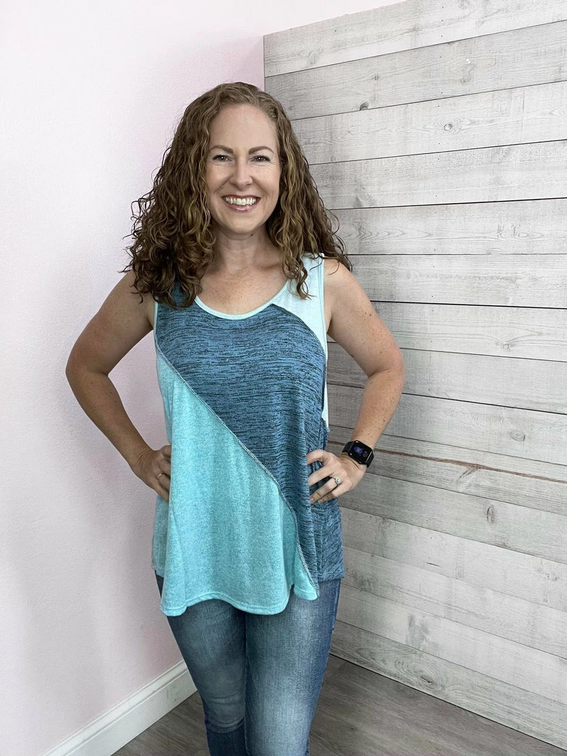This light heather grey top features a color block pattern with coral, mint, and blue, short sleeves, a round neckline, and a straight hemline. Go down a size!