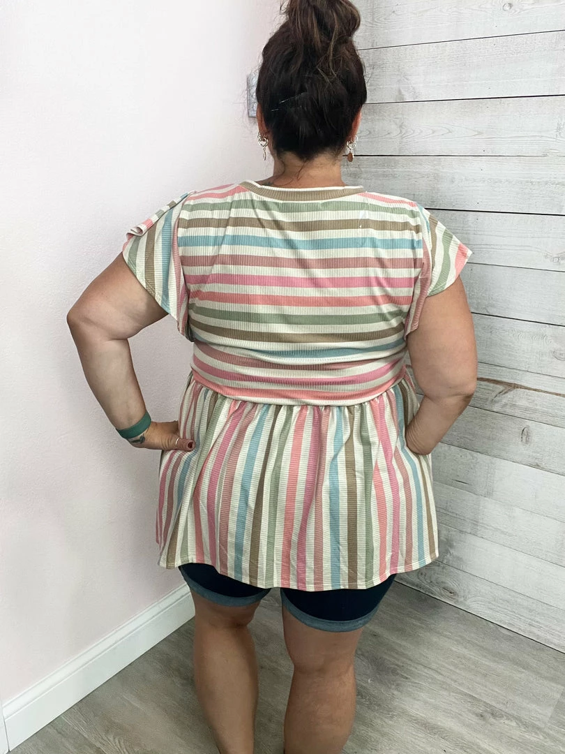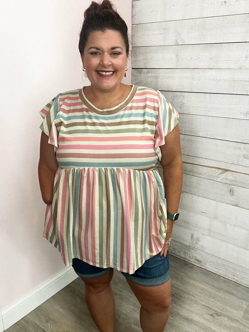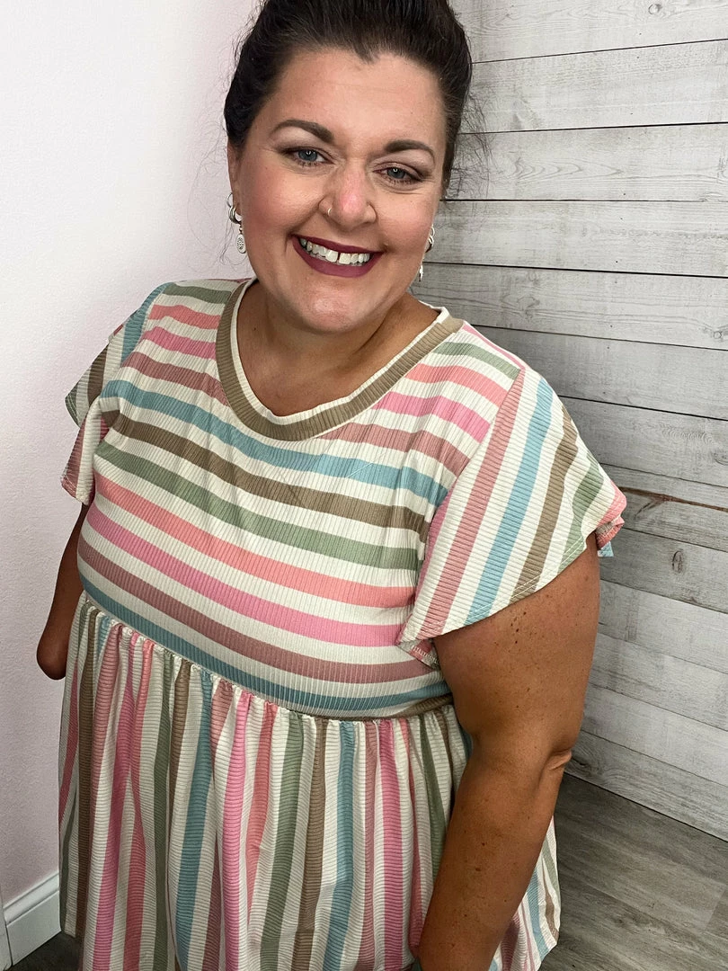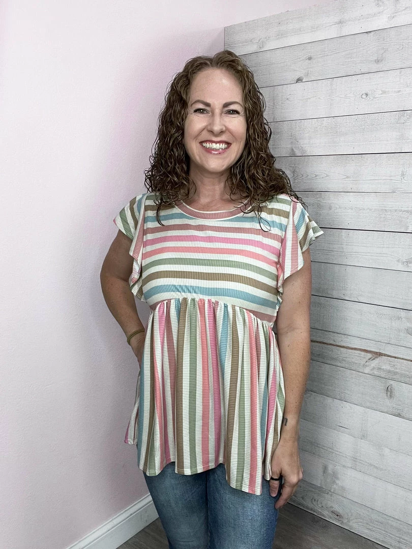 Multi-color rainbow stripe babydoll top featuring a round neckline, ruffle short sleeve, and ribbed texture. True to size!