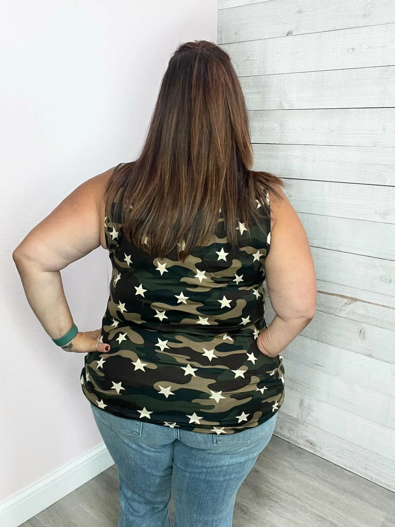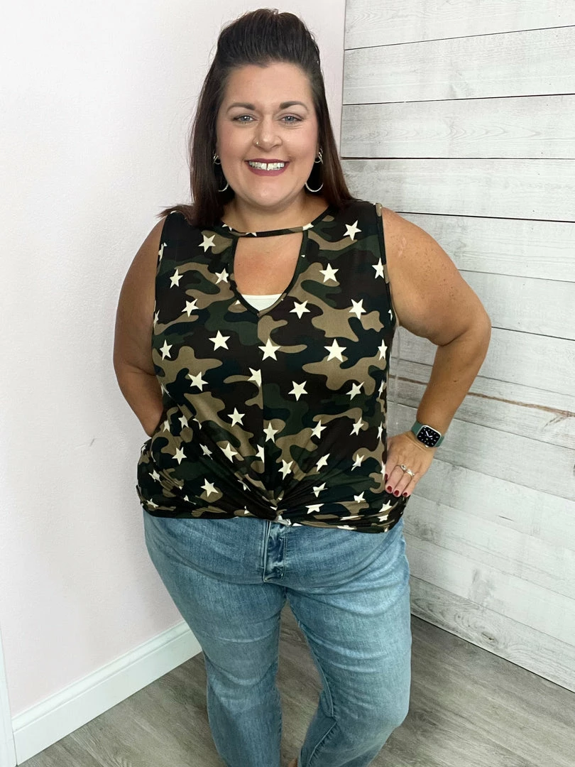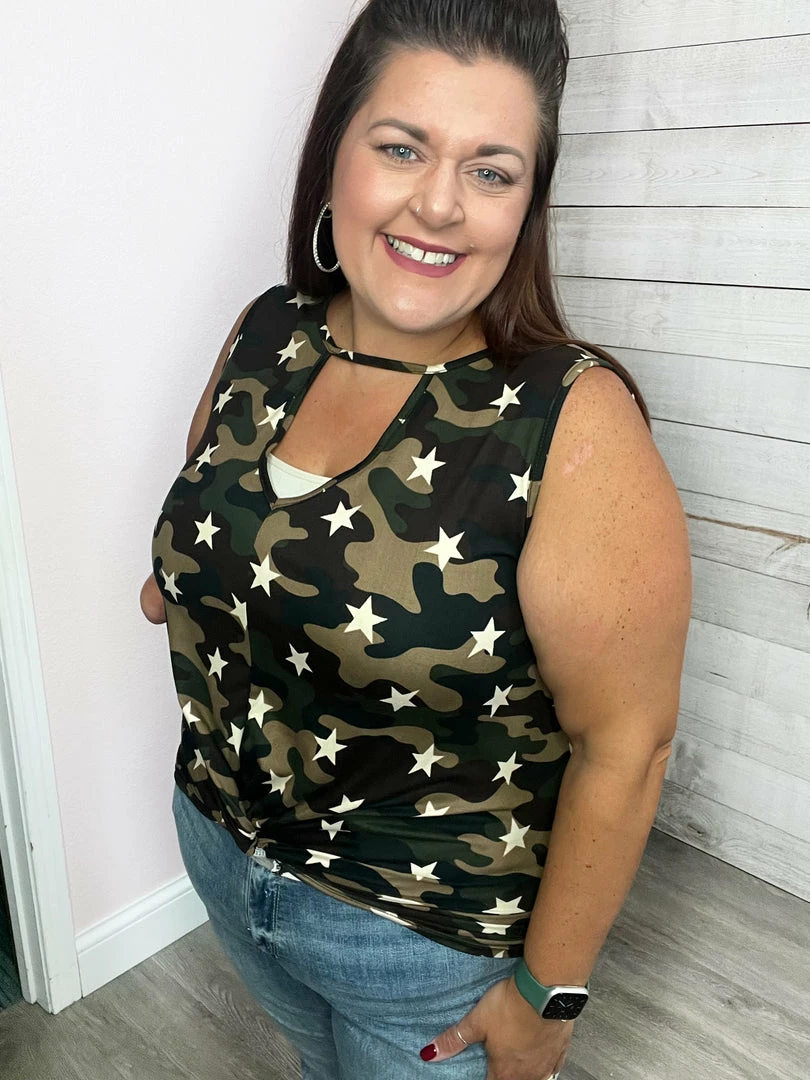 Camouflage star print sleeveless top featuring a cutout neckline and twist detail on the hemline. True to size or go down.