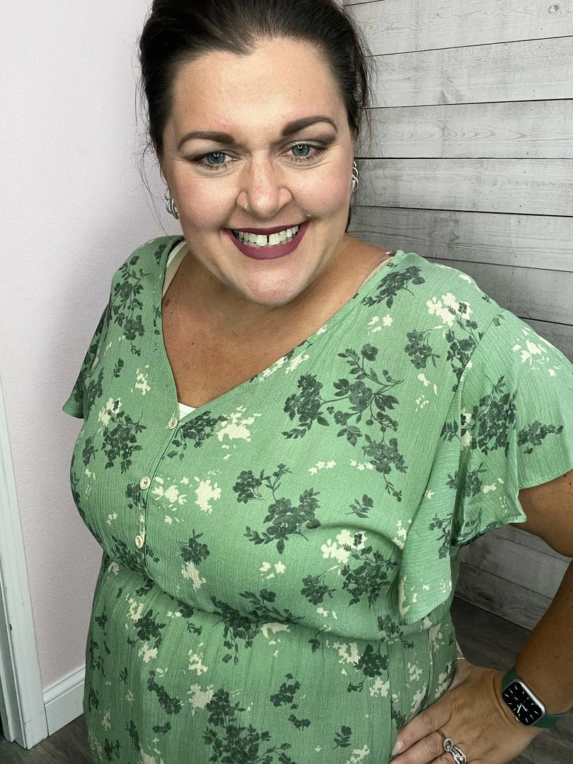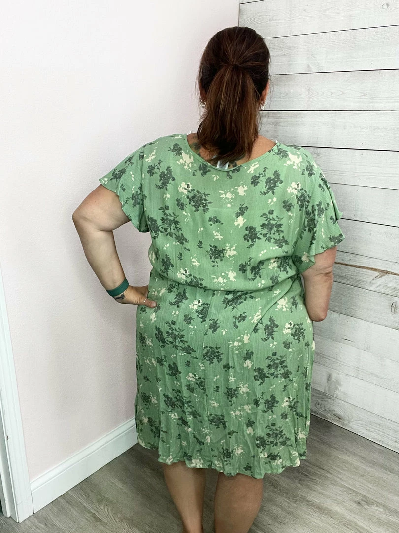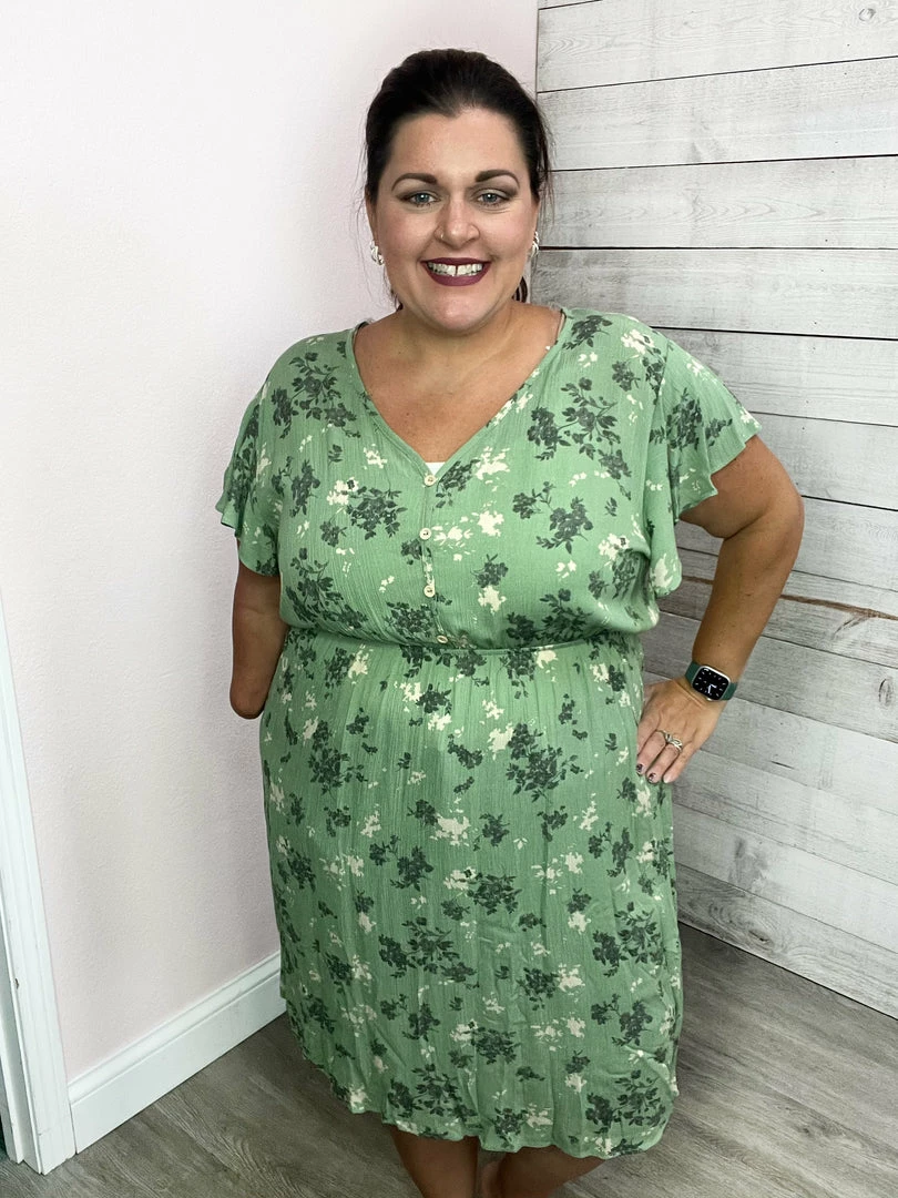 A sage woven dress with ivory and grey floral print featuring a V neckline with faux buttons, ruffle short sleeves, and an elastic waistline. True to size!