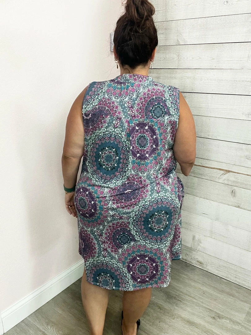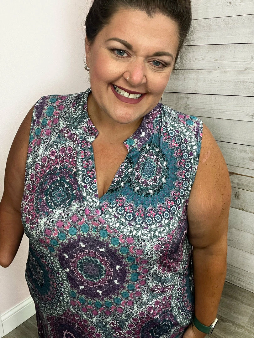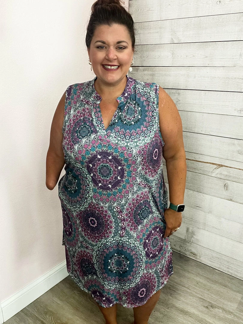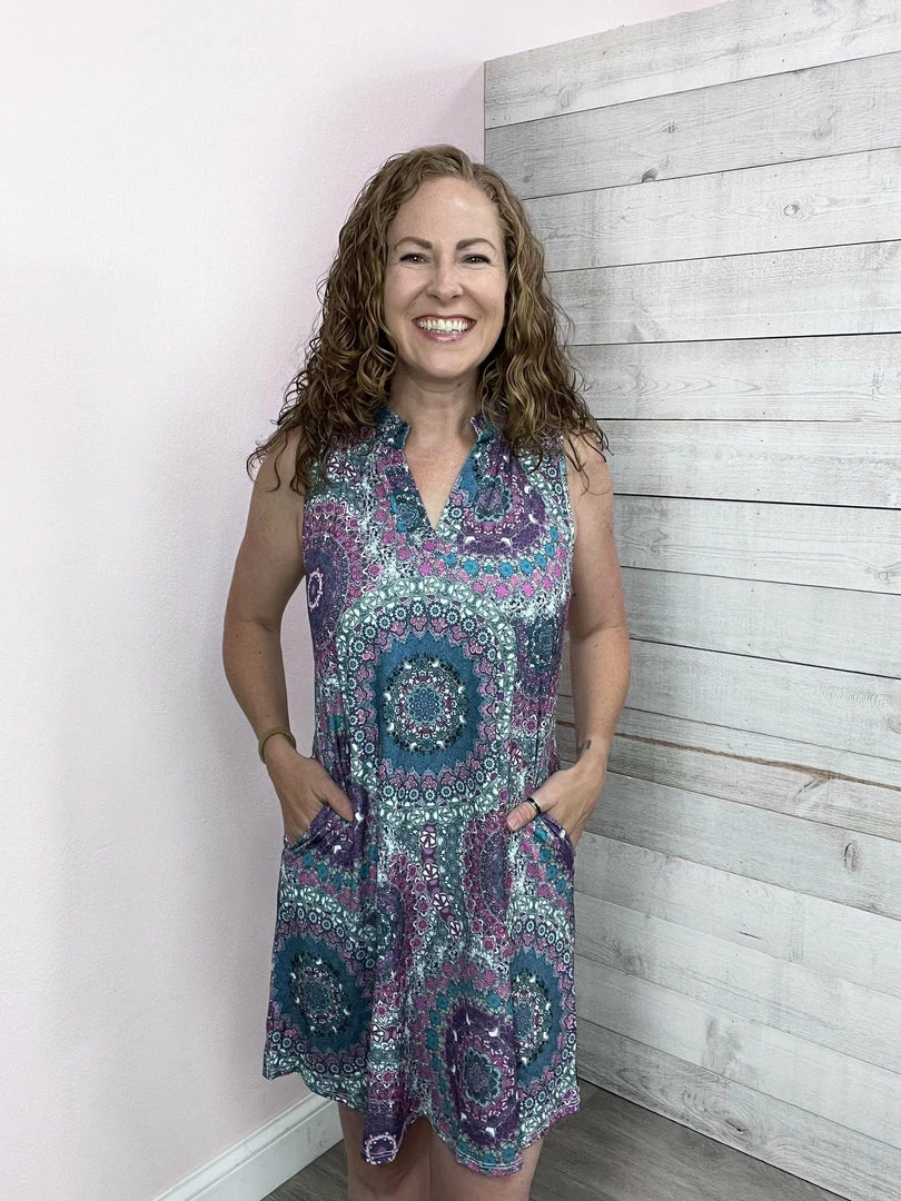 Gabby tank dress with pockets! Purple and teal paisley print. True to size!