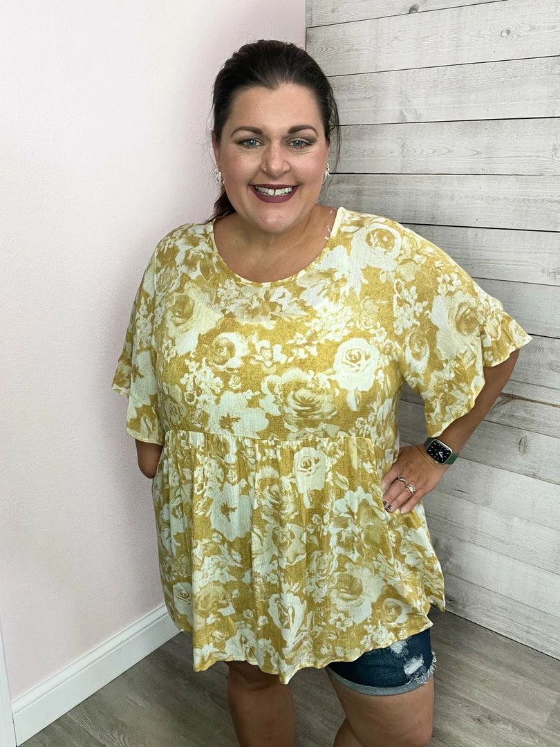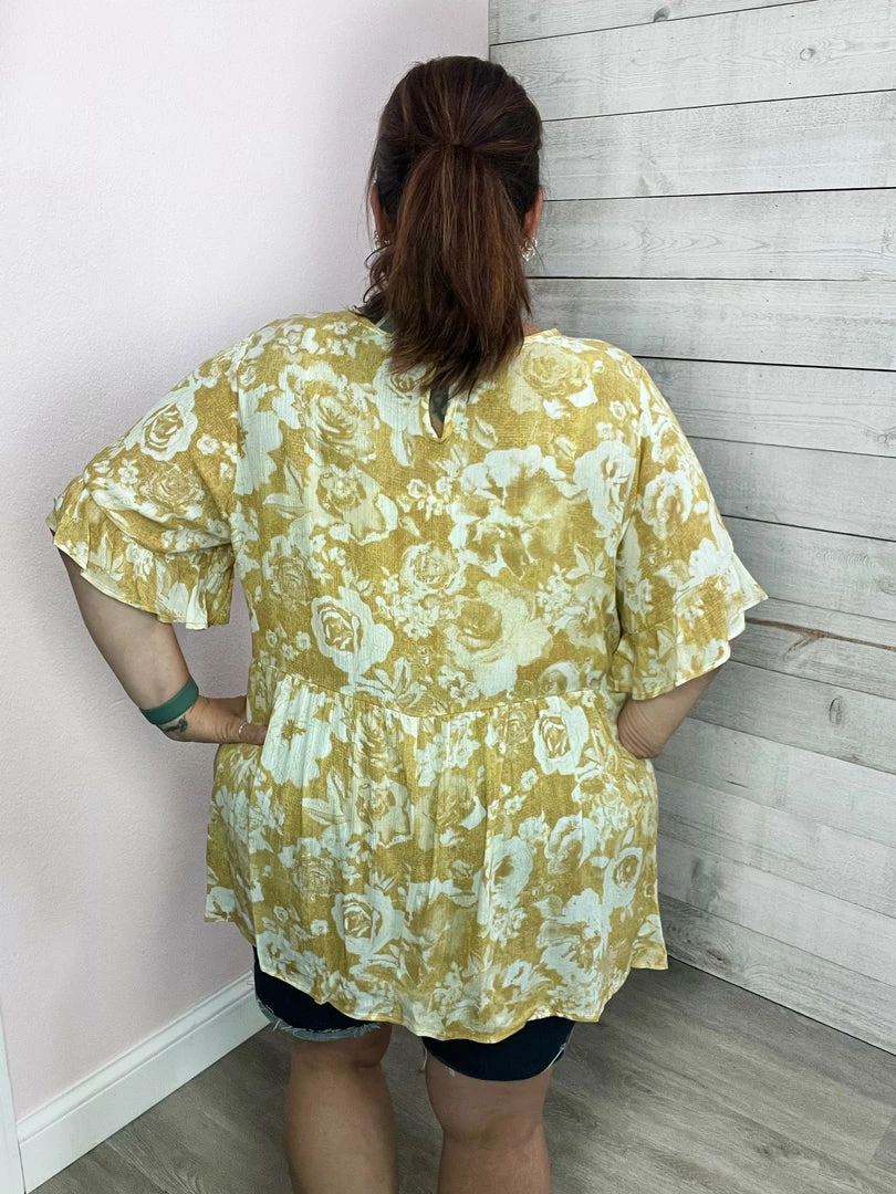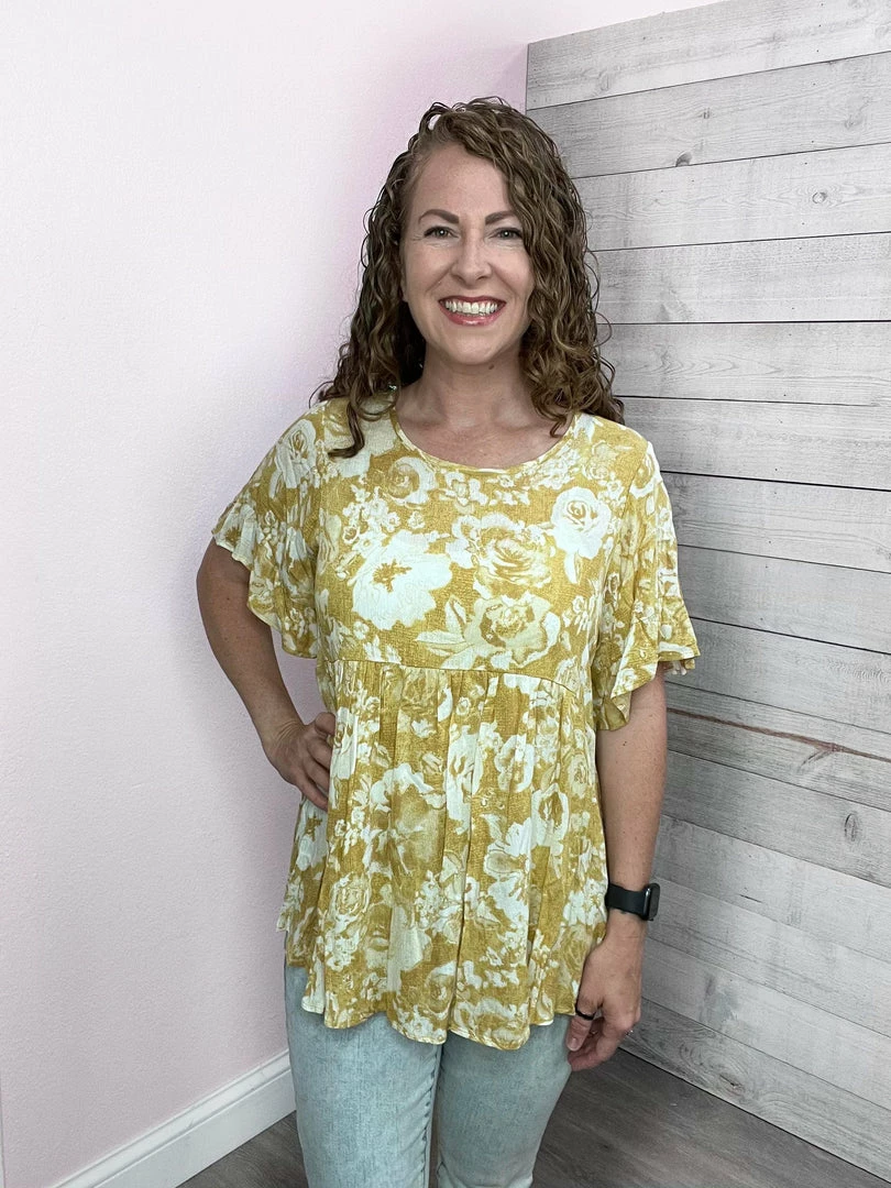 Yellow babydoll top featuring an ivory floral print, short sleeves, round neckline, and a buttoned keyhole on the back. True to size!