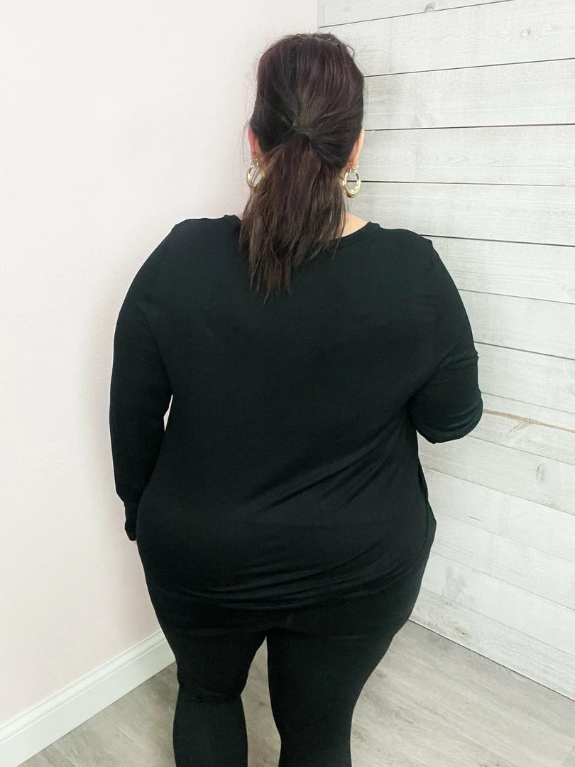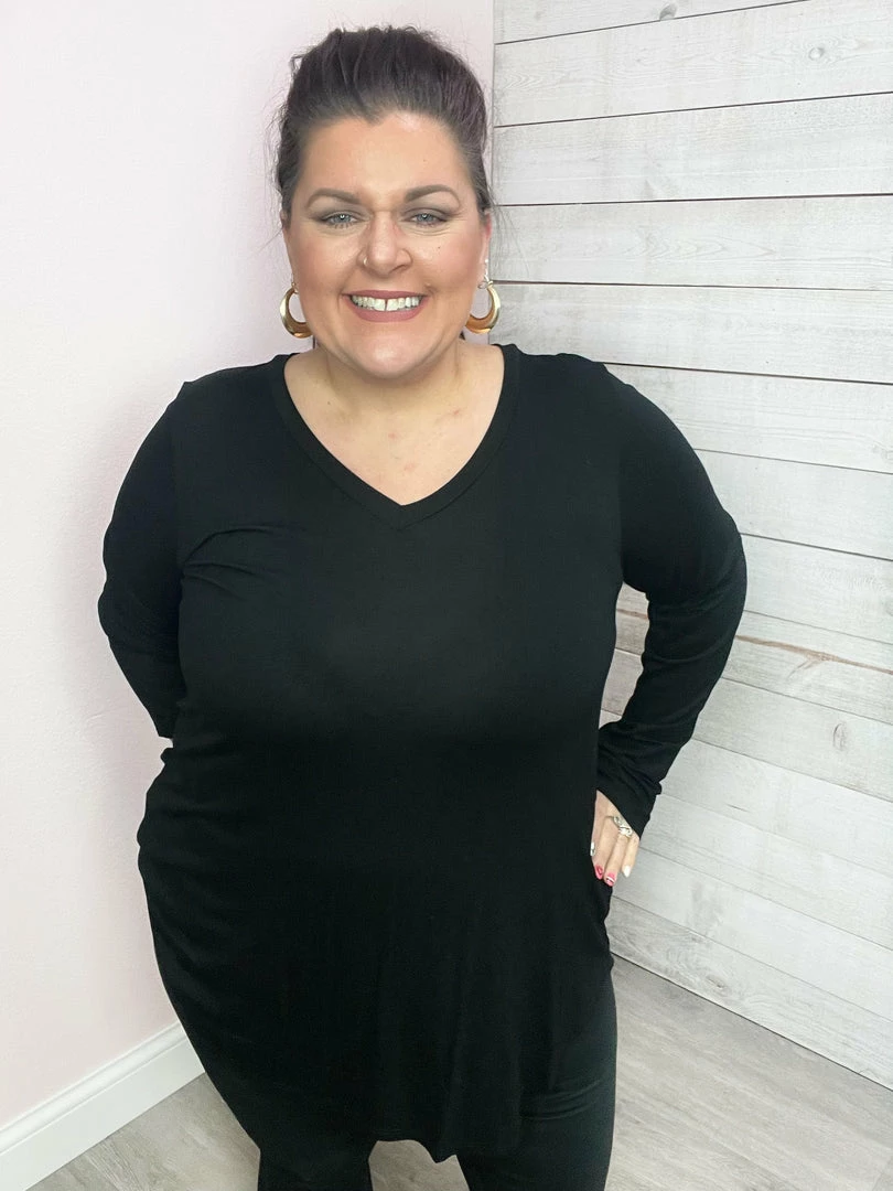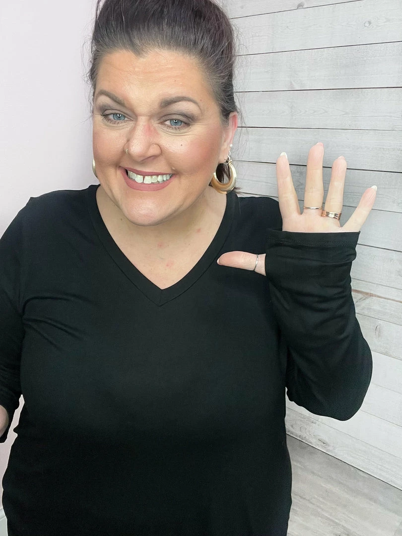 Solid long sleeve top featuring a V neckline, dolphin hemline, and thumbholes! True to size!