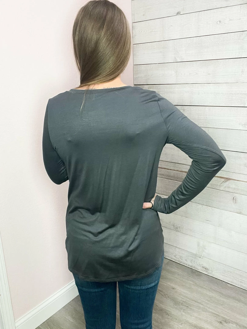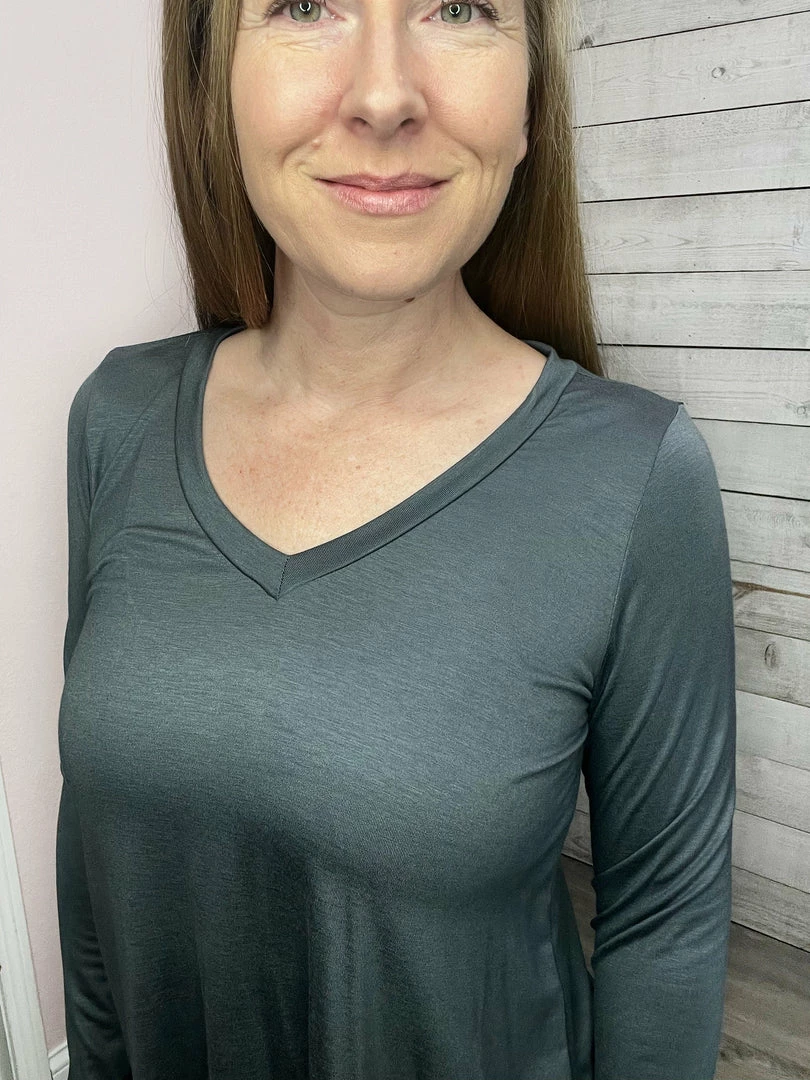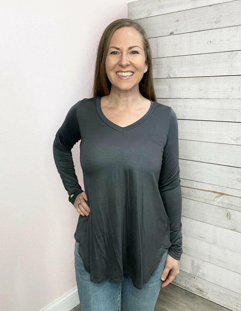 Solid long sleeve top featuring a V neckline, dolphin hemline, and thumbholes! True to size!
