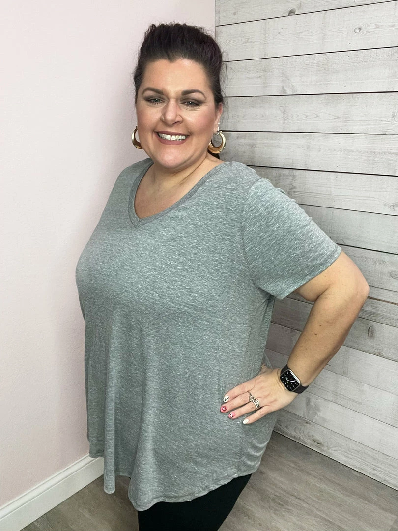 A great basic everyone needs! V neck short sleeve top with a dolphin hemline. Comes in two colors Heather Grey or Oatmeal. True to size!