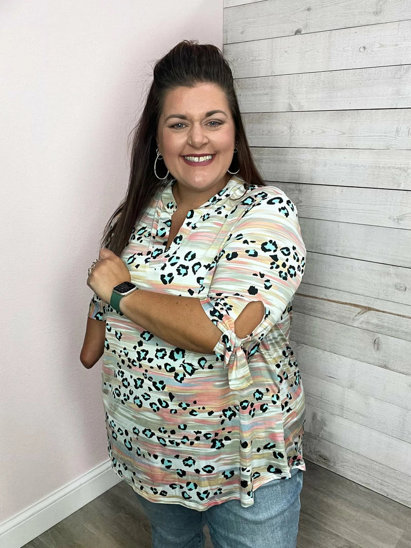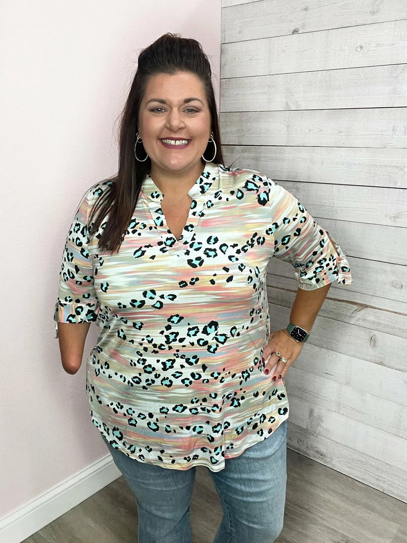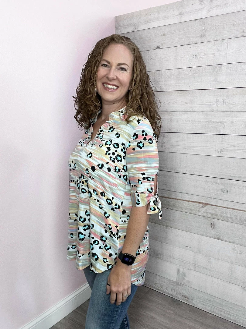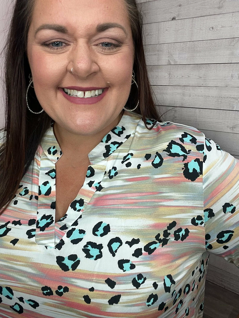 Multi-color gabby top with a teal animal print featuring a V neckline, quarter-length sleeves with a tied knot at the end, and a high-low dolphin hemline. True to size!