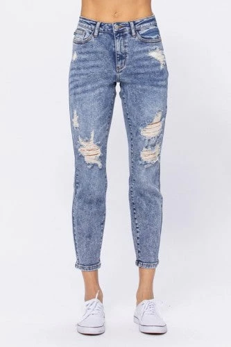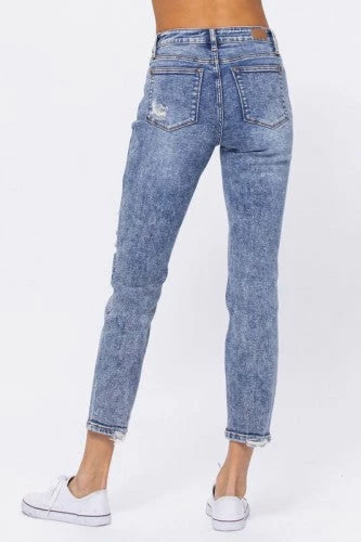 Judy Blue boyfriend jeans featuring a high-waist and destroyed acid wash detail. They deliver comfort and the perfect stretch all day long. True to Judy Blue size.